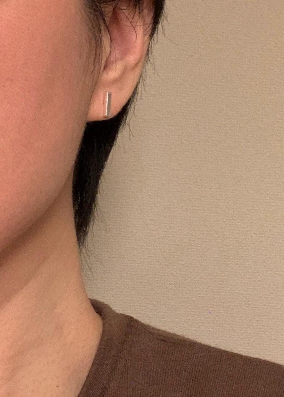 These earrings fit perfectly without sticking out from my earlobes, and the surface has a beautiful glossy silver finish. What I especially love is the rough, hand-chiseled texture at both ends of the bar—it gives them such character. Silvia's work has a unique charm, blending modern design with the warmth of handcrafted artistry.