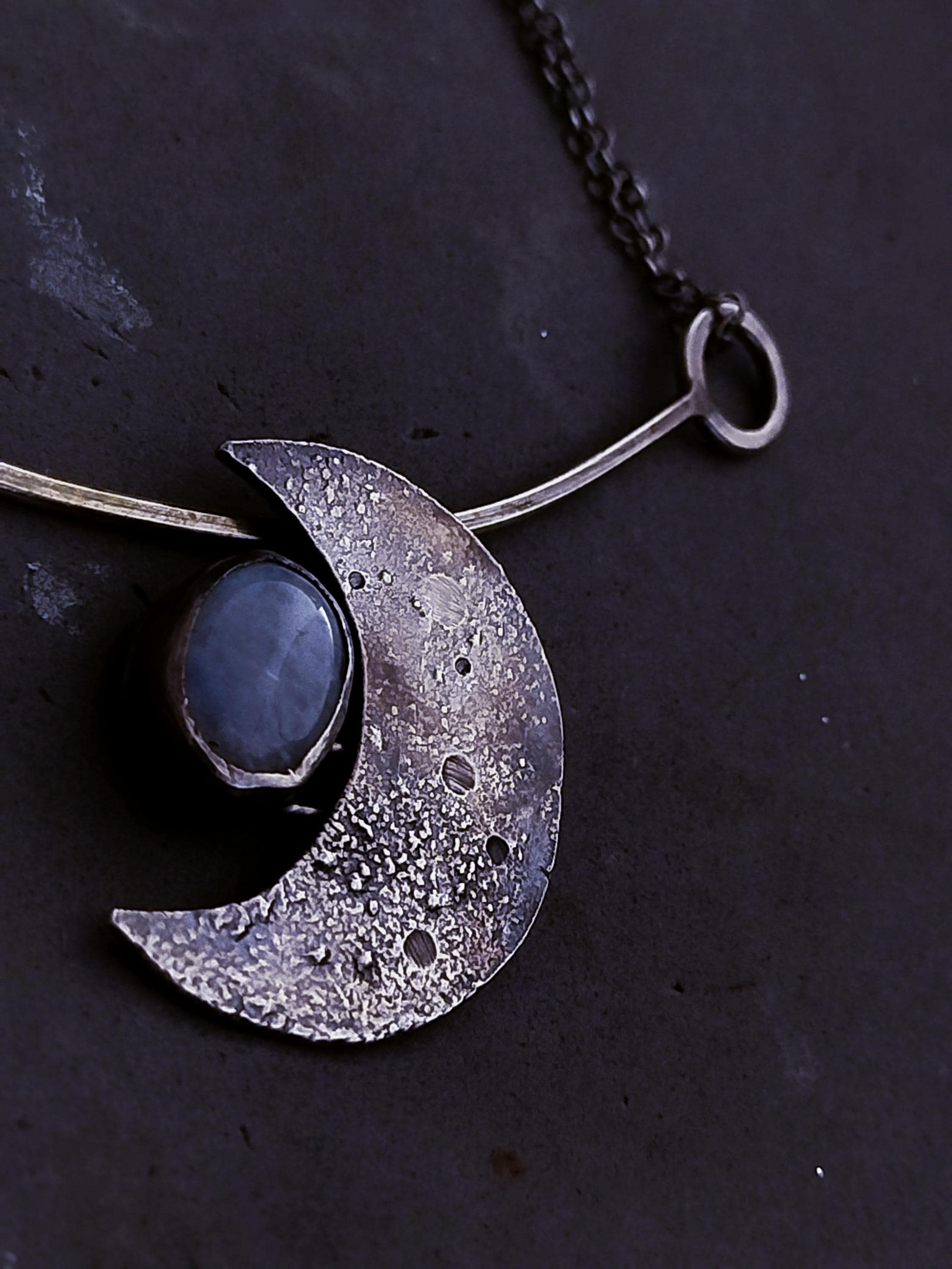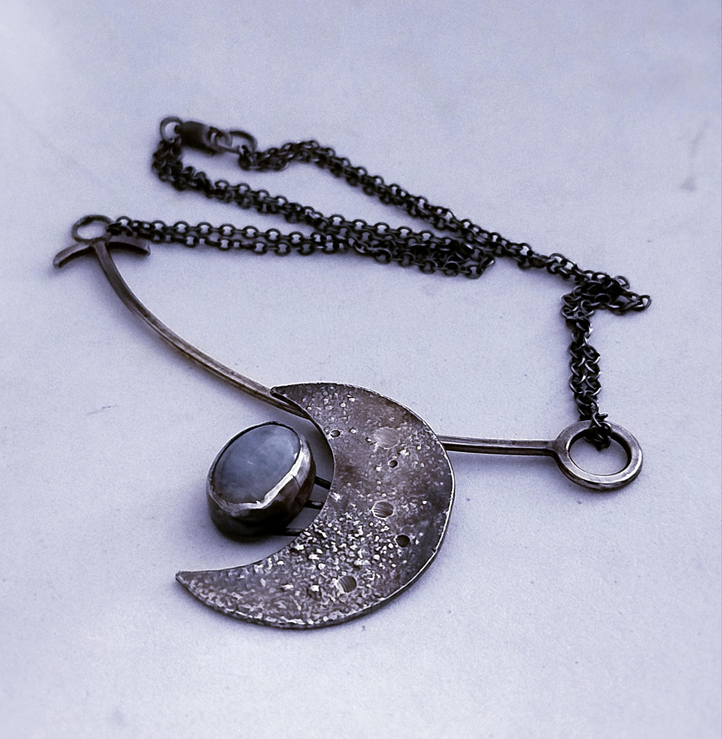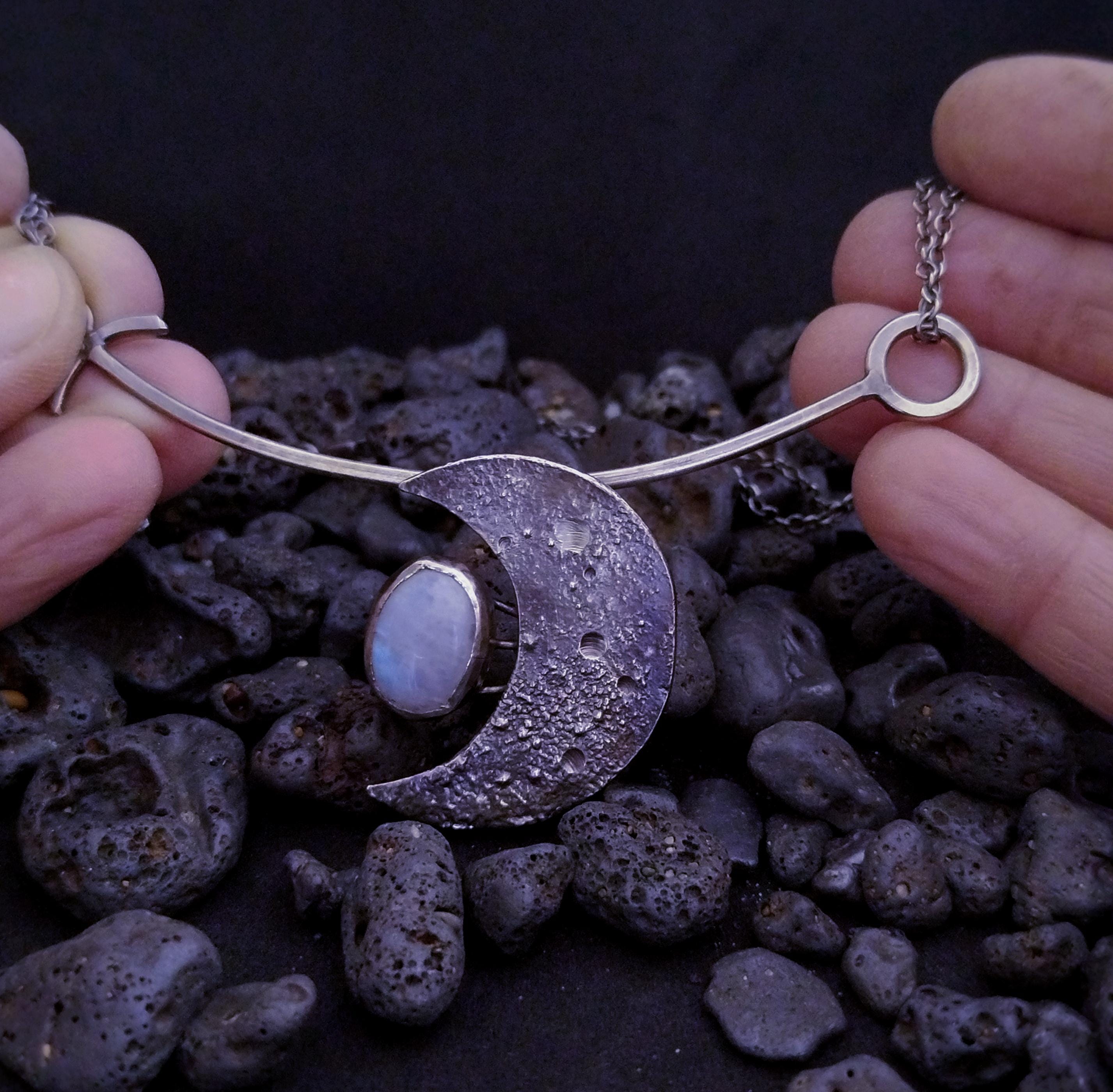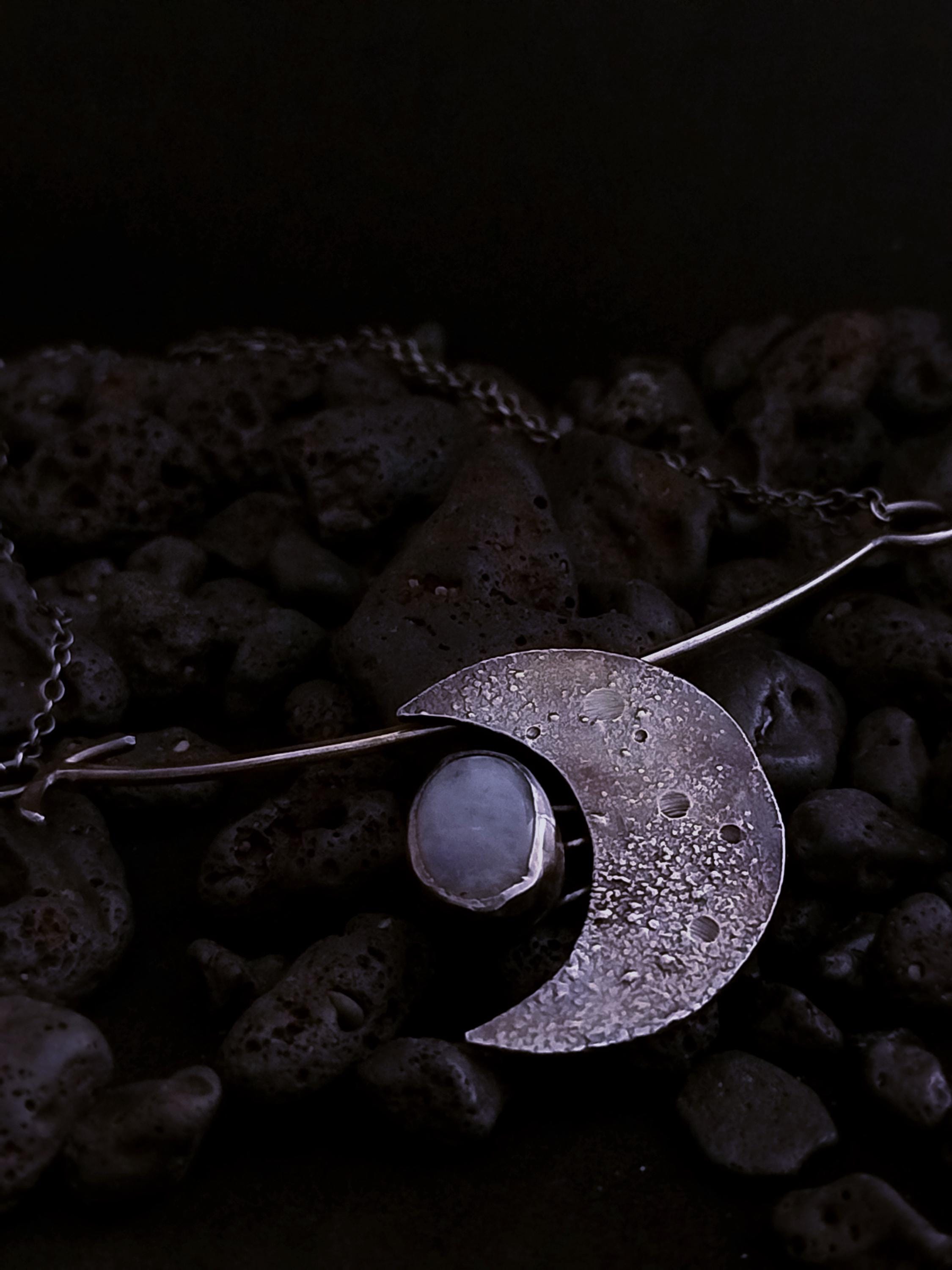 This handcrafted pendant features a crescent moon in sterling silver, textured using reticulation to evoke the lunar surface, paired with a suspended moonstone cabochon held by discreet soldering.