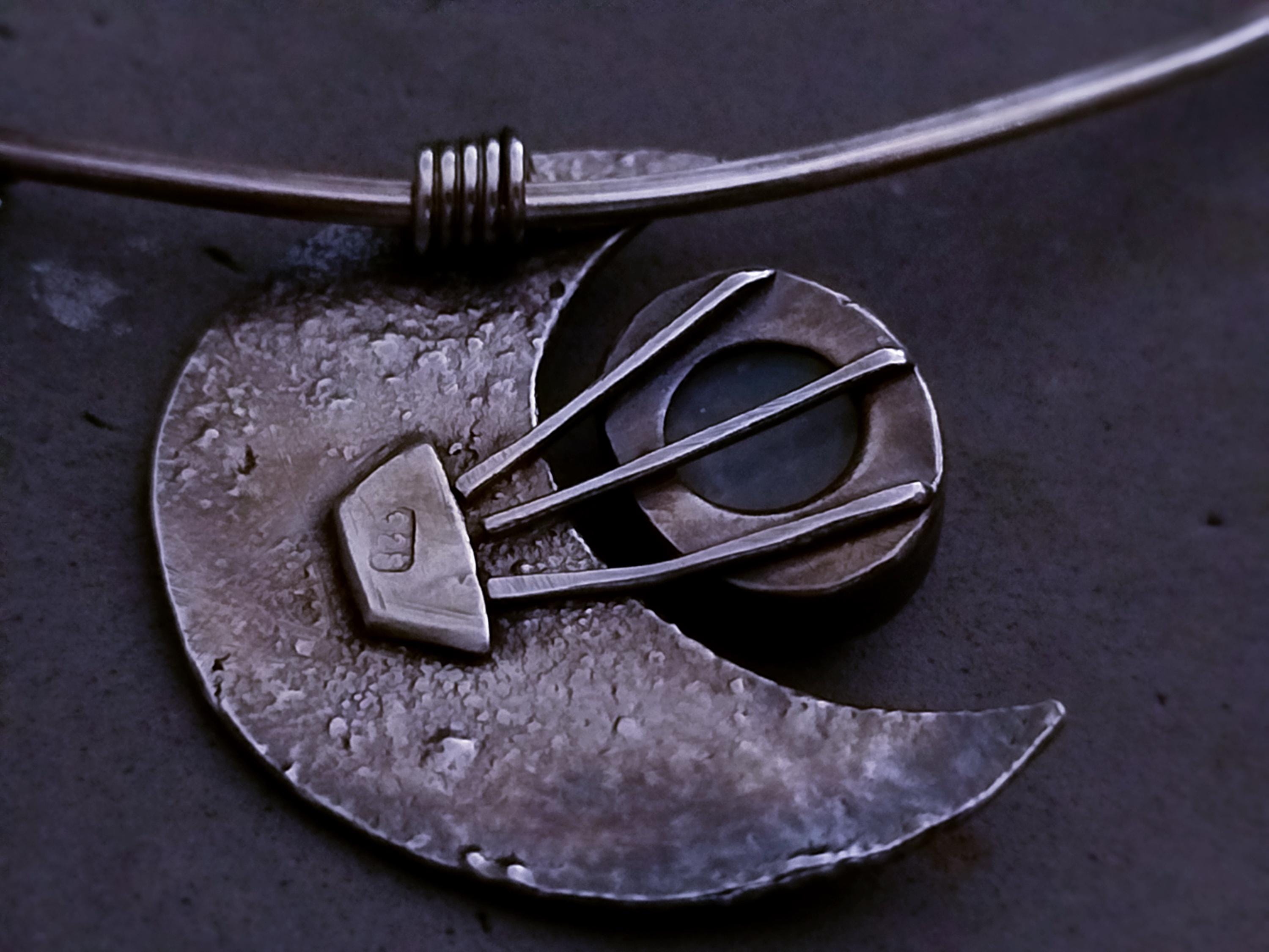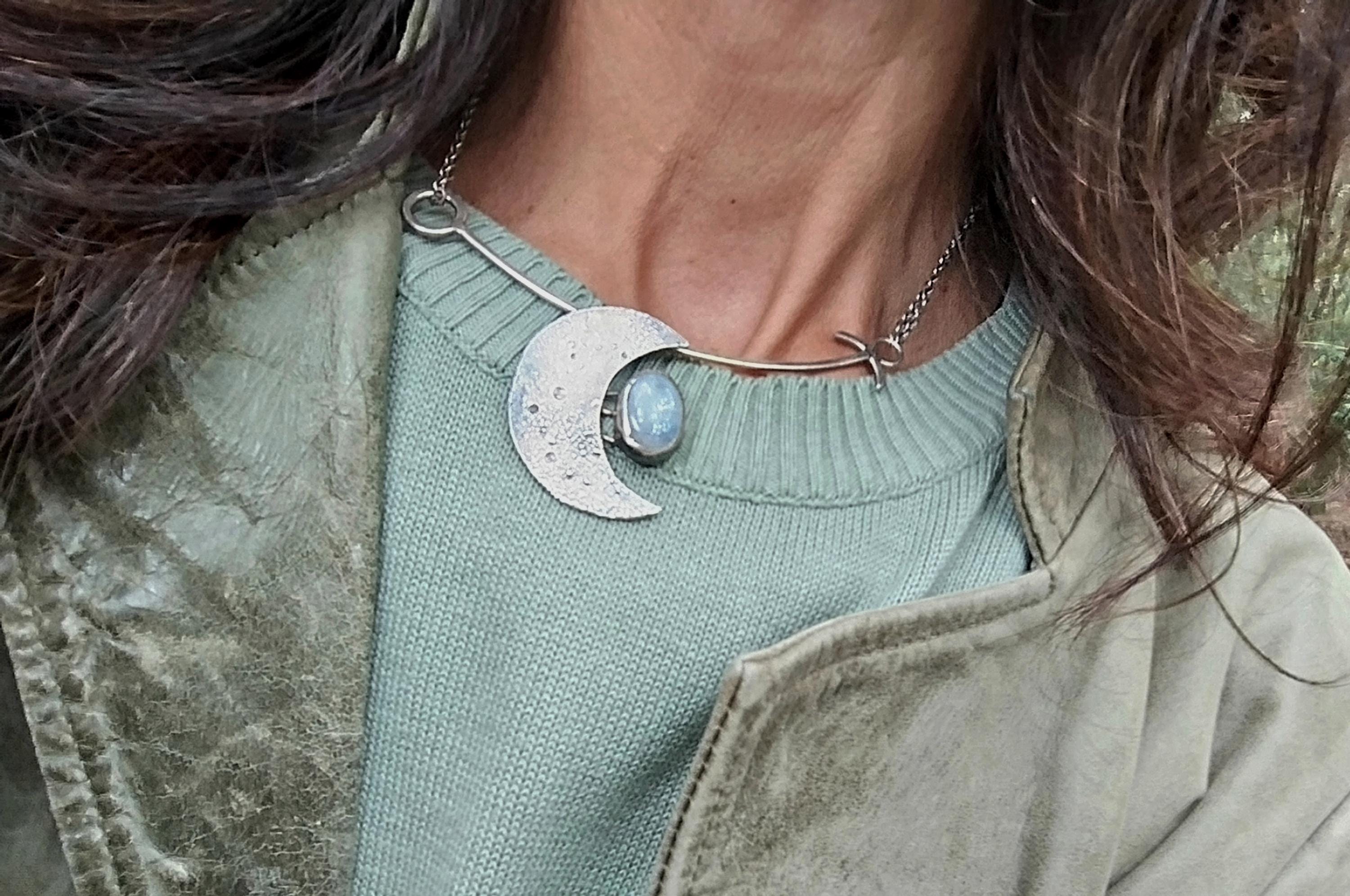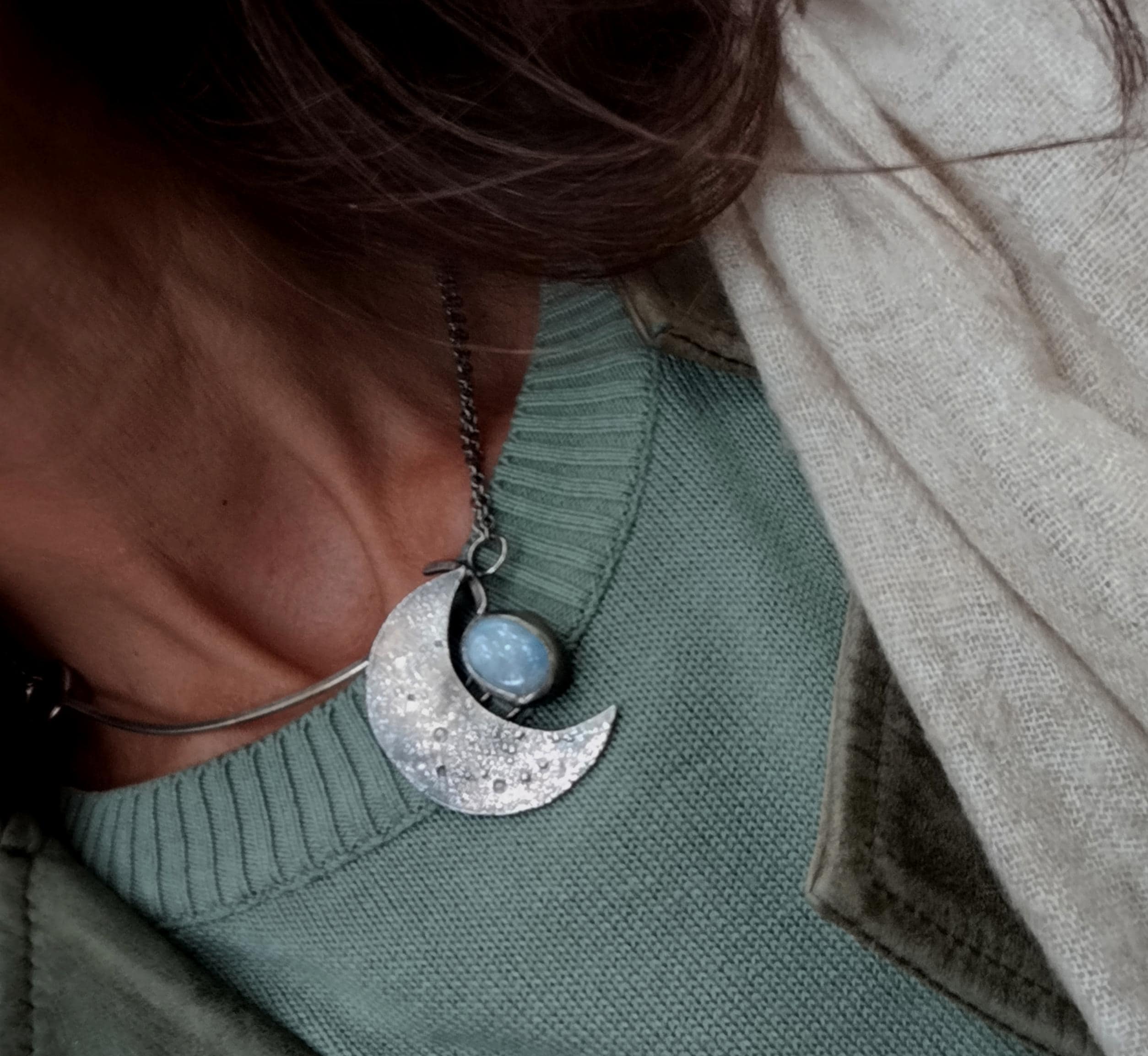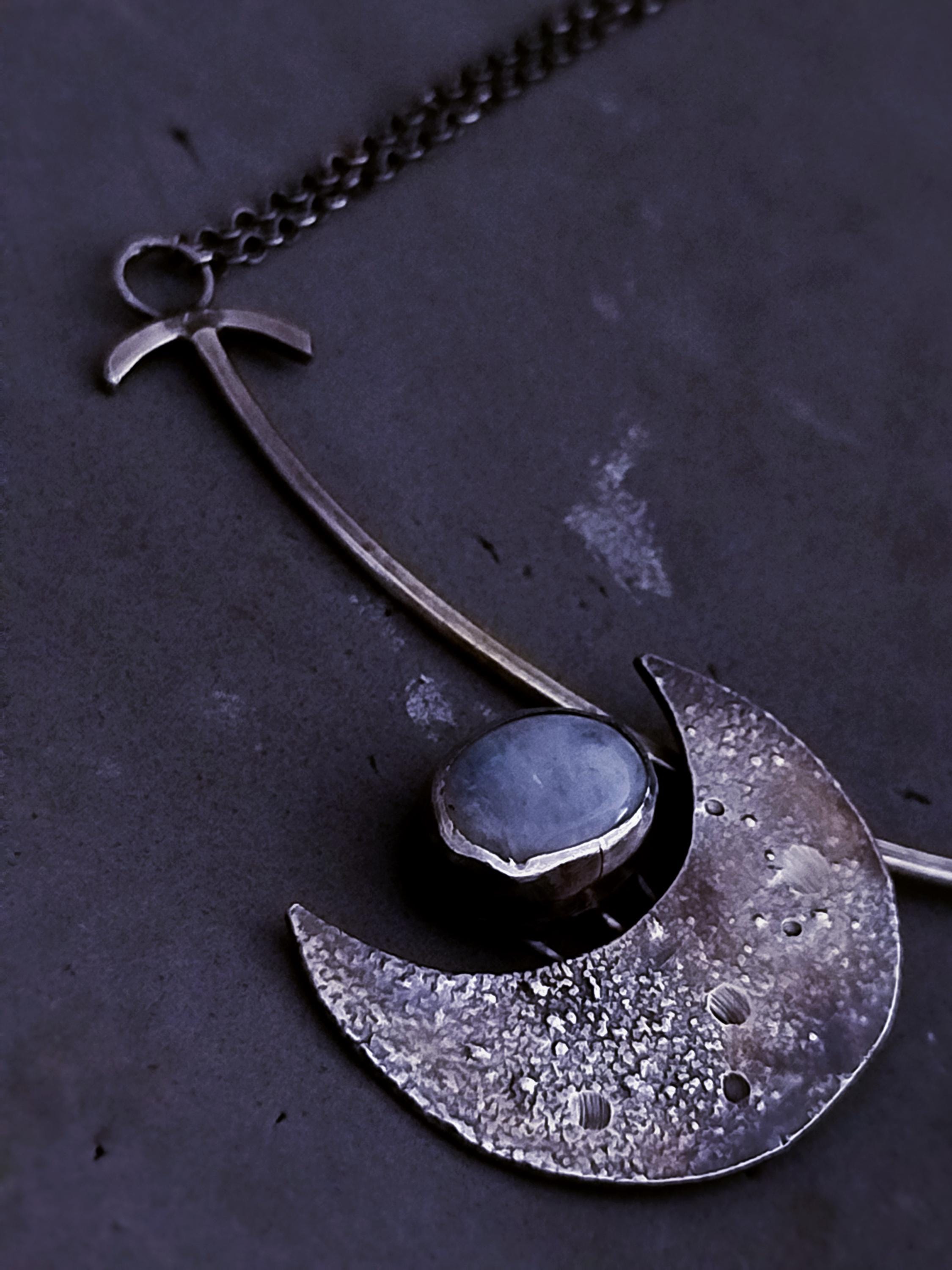 This handcrafted pendant features a crescent moon in sterling silver, textured using reticulation to evoke the lunar surface, paired with a suspended moonstone cabochon held by discreet soldering.