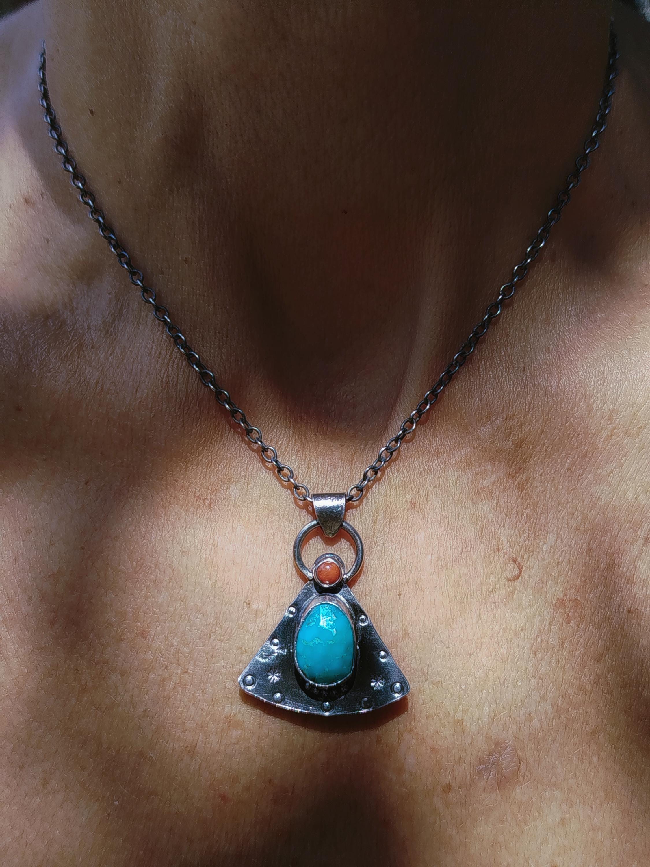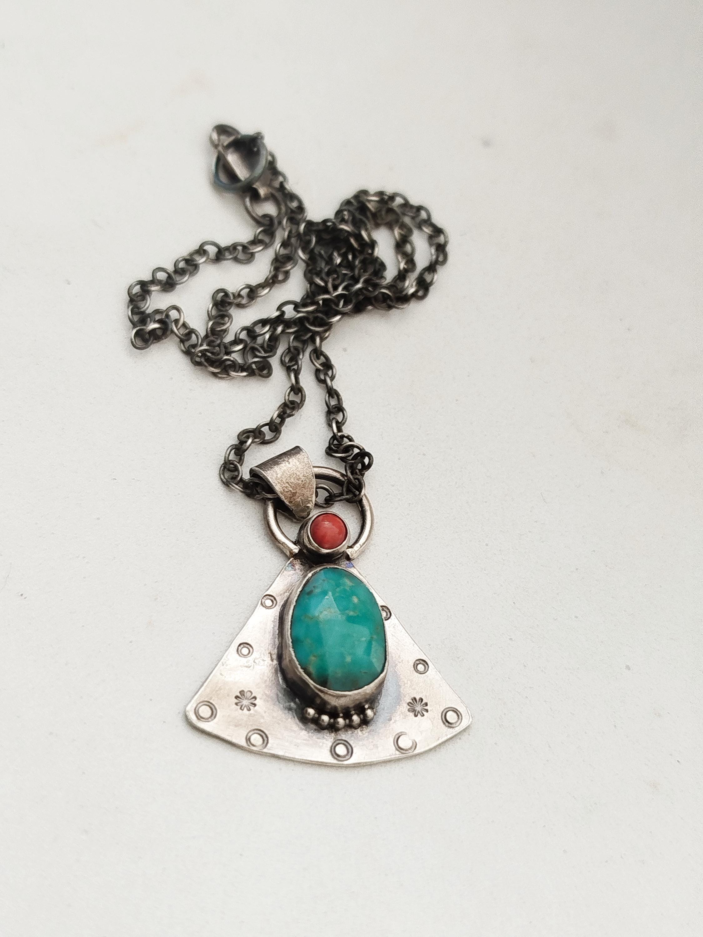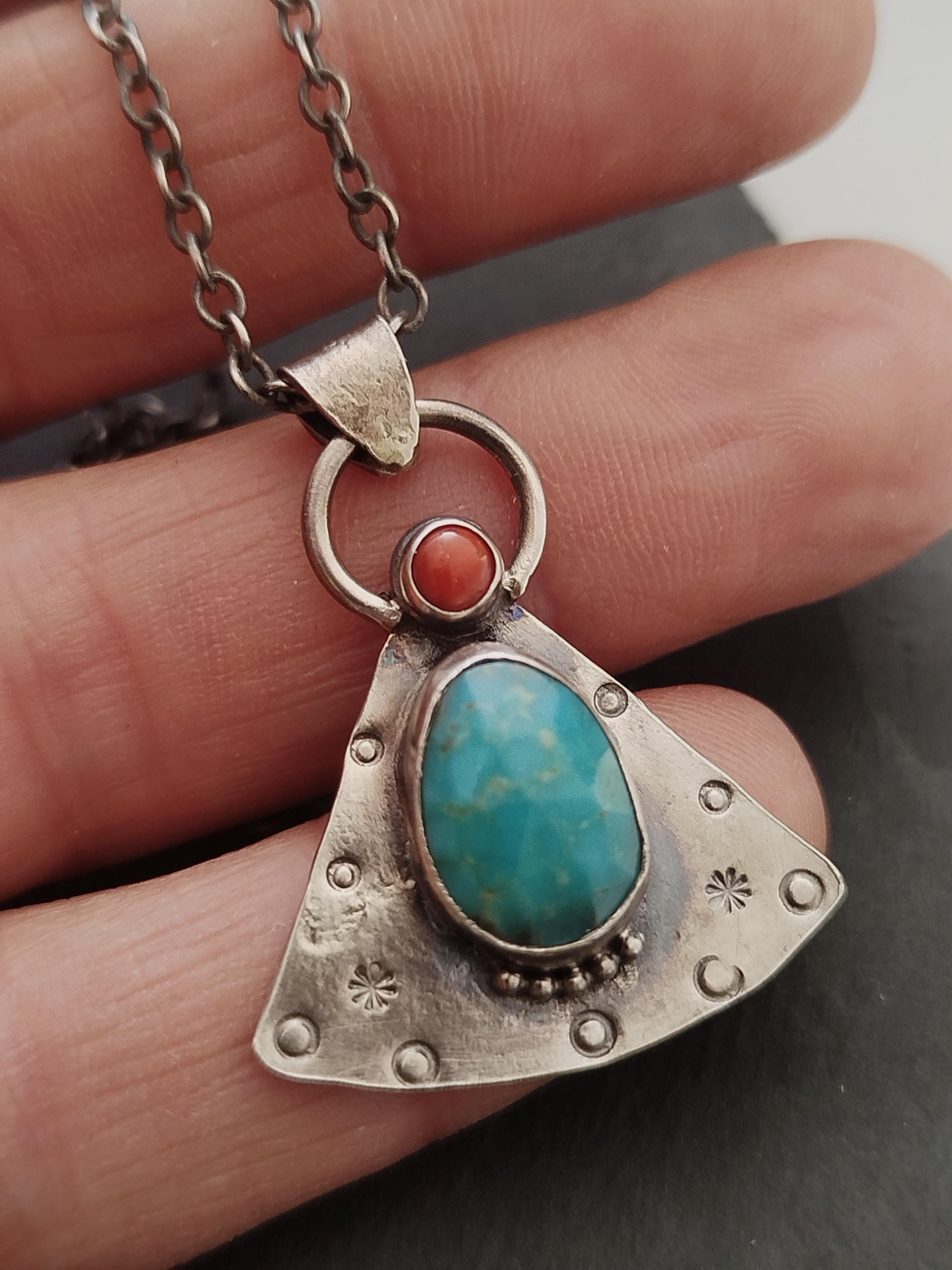 Turquoise and Coral Amulet Necklace, Handmade Sterling Silver OOAK Spiritual Jewelry