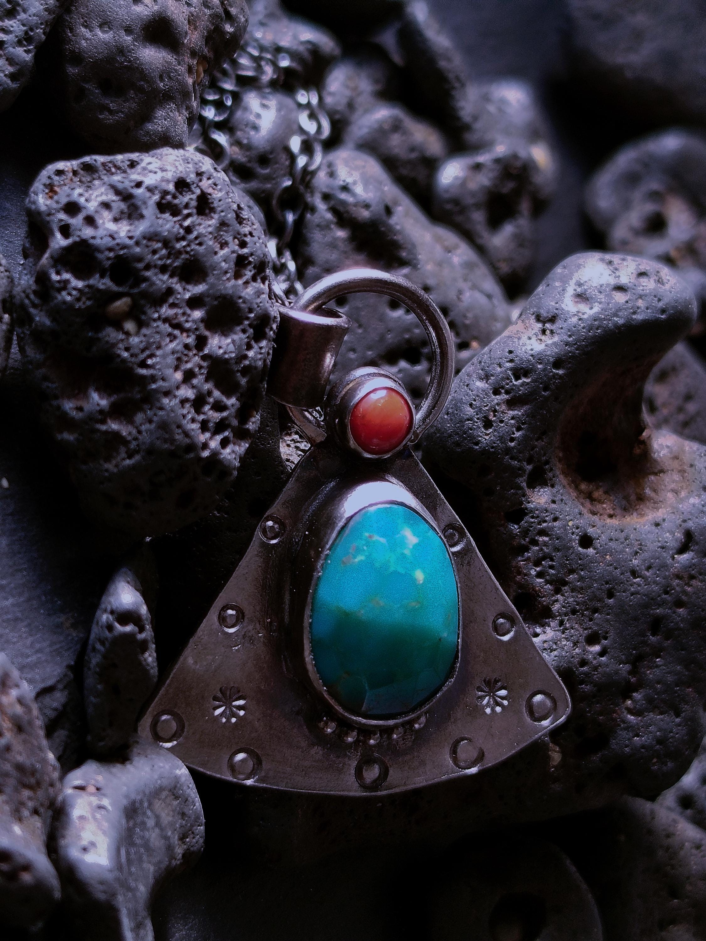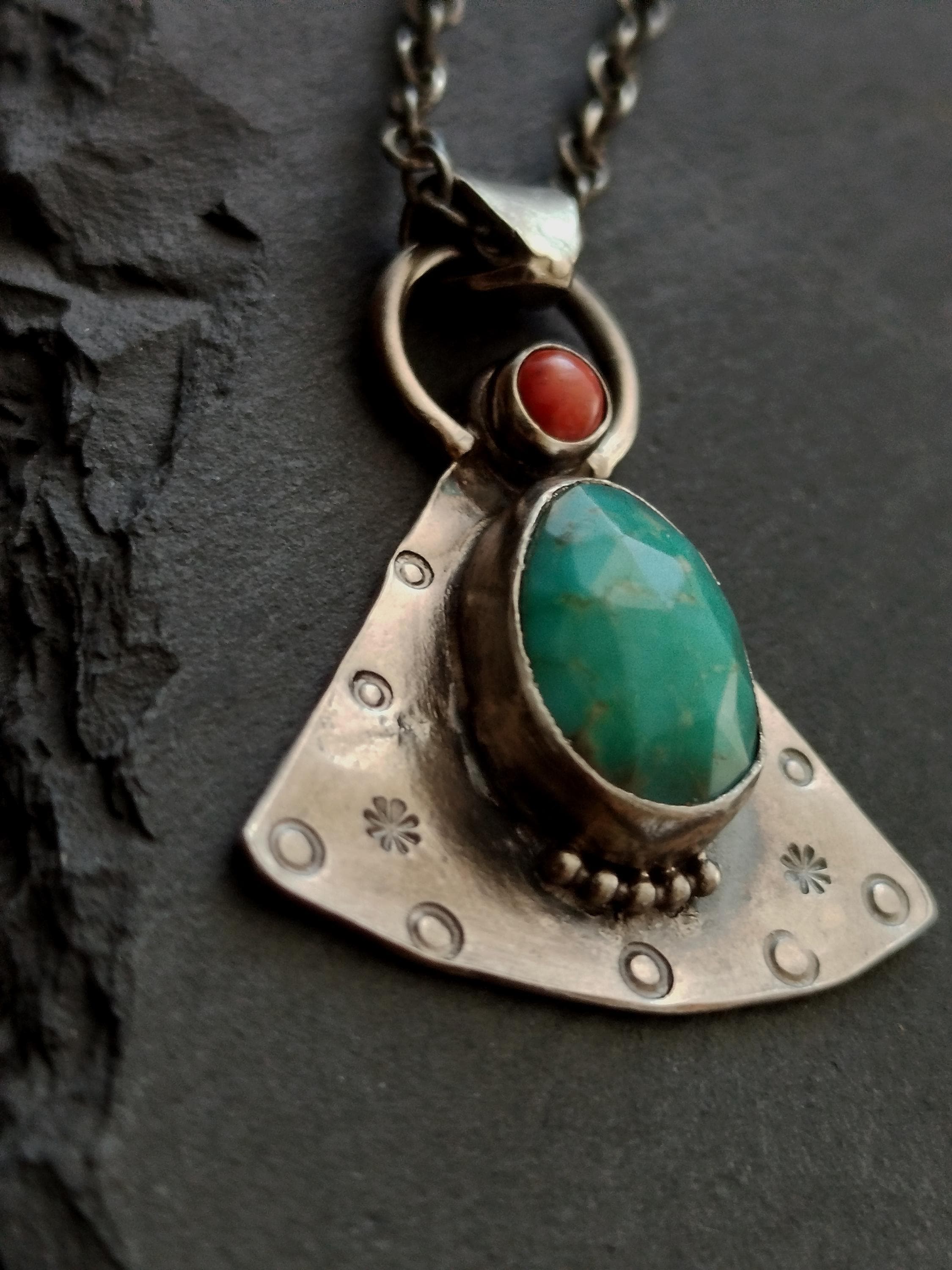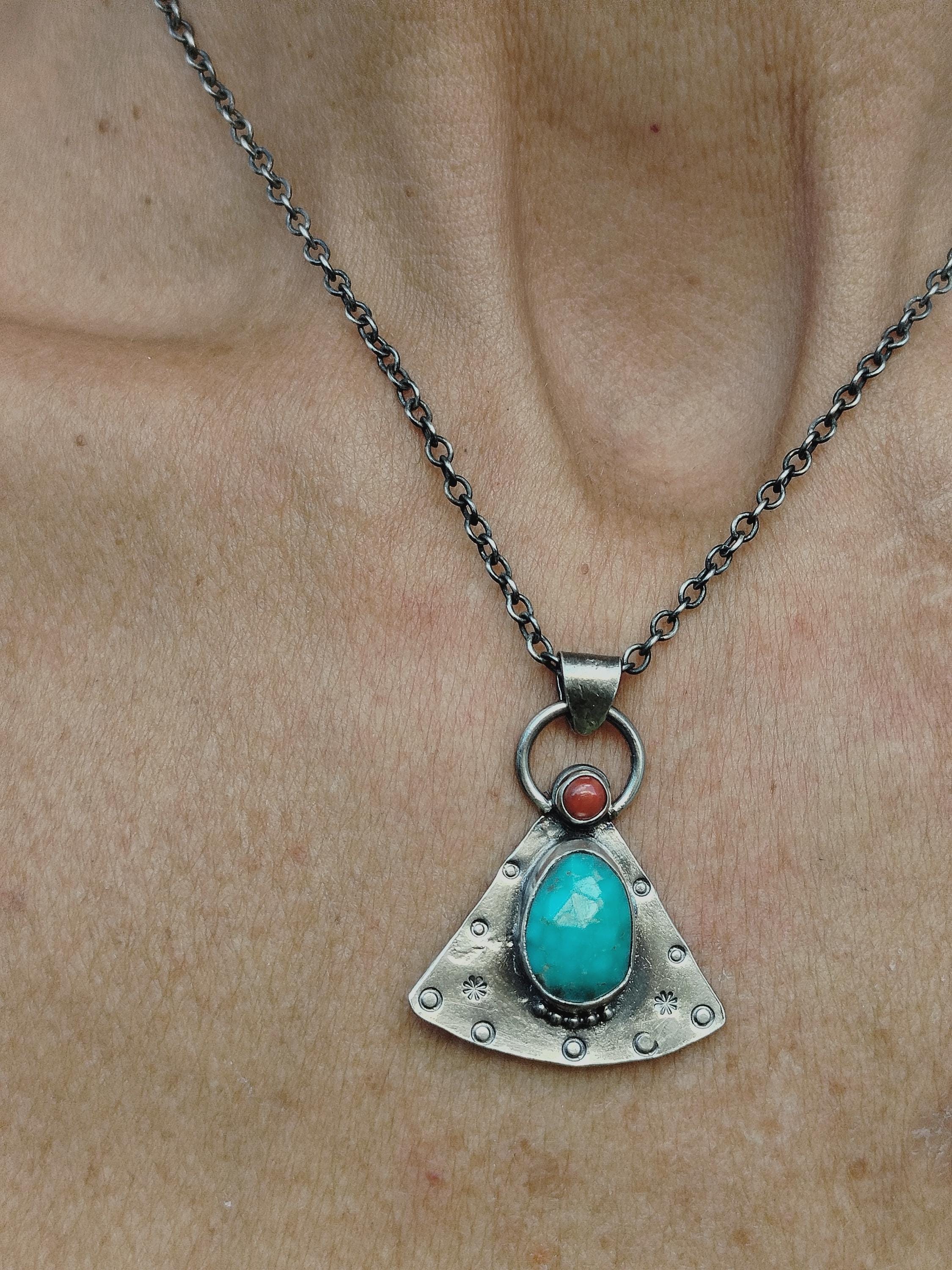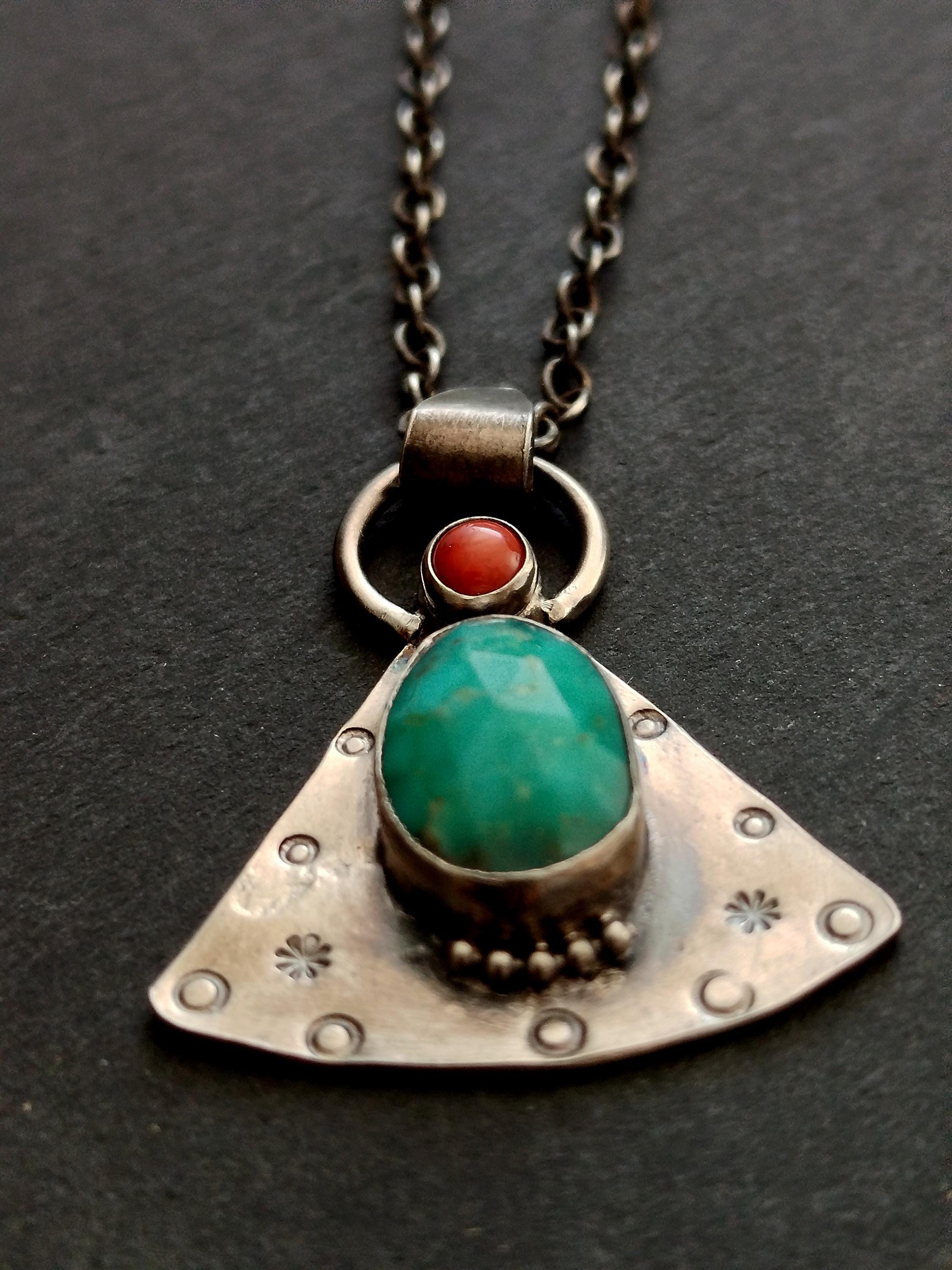 Turquoise and Coral Amulet Necklace, Handmade Sterling Silver OOAK Spiritual Jewelry