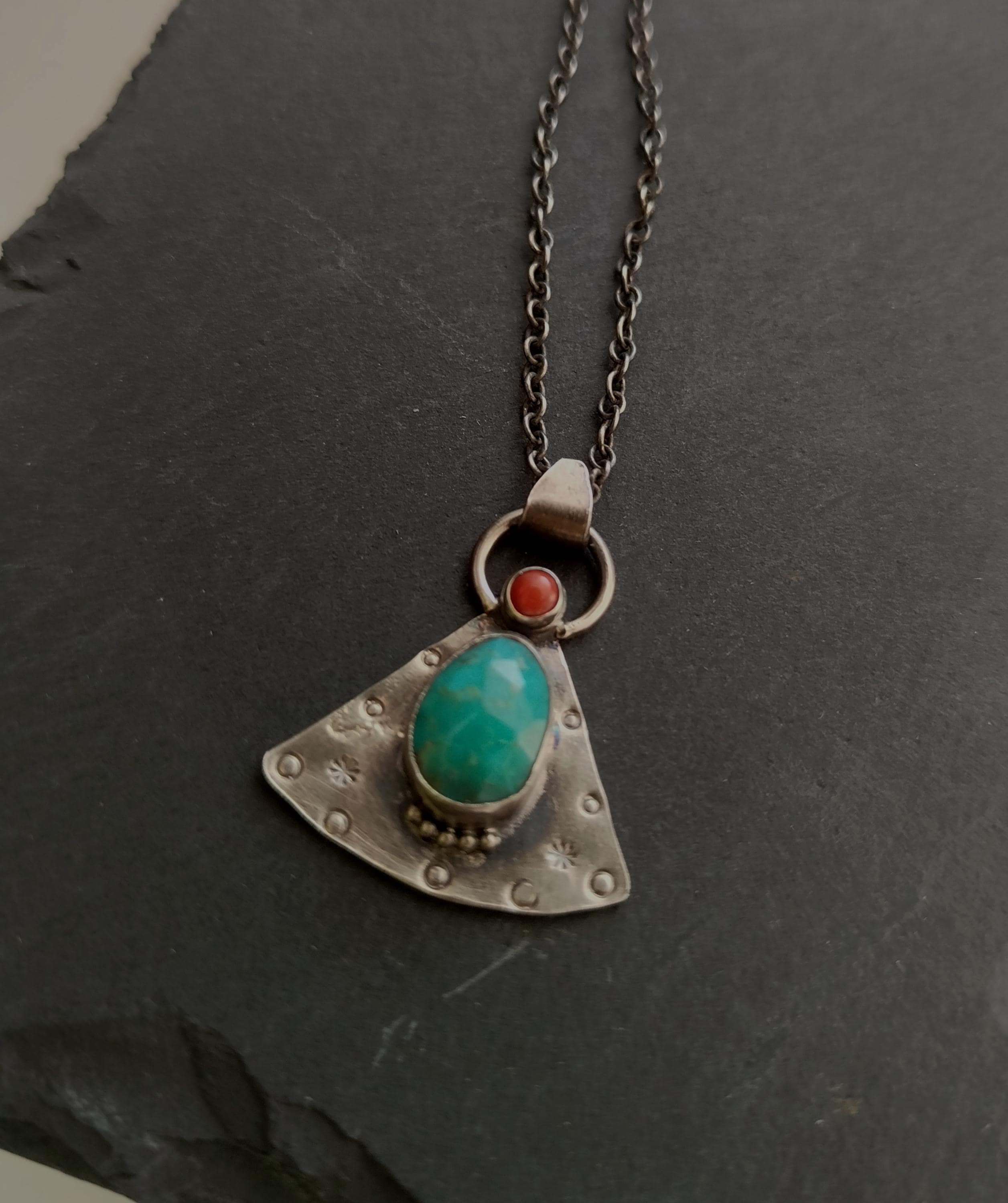A necklace that tells a story. This one-of-a-kind piece is entirely handmade in sterling silver, featuring a large central turquoise and a small red coral set above it. Together, they symbolise the meeting of earth and sea, intuition and passion, protection and grounding.