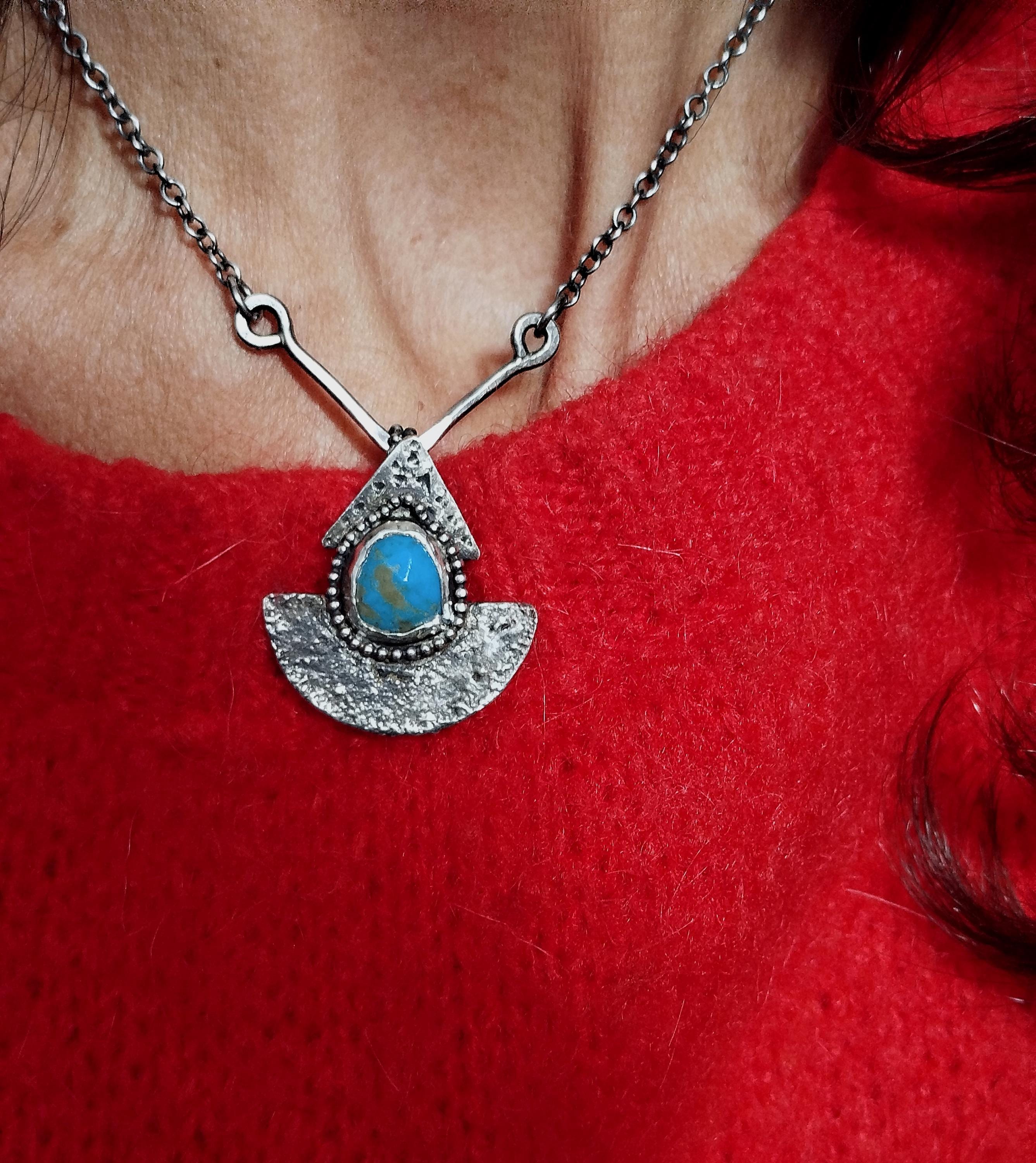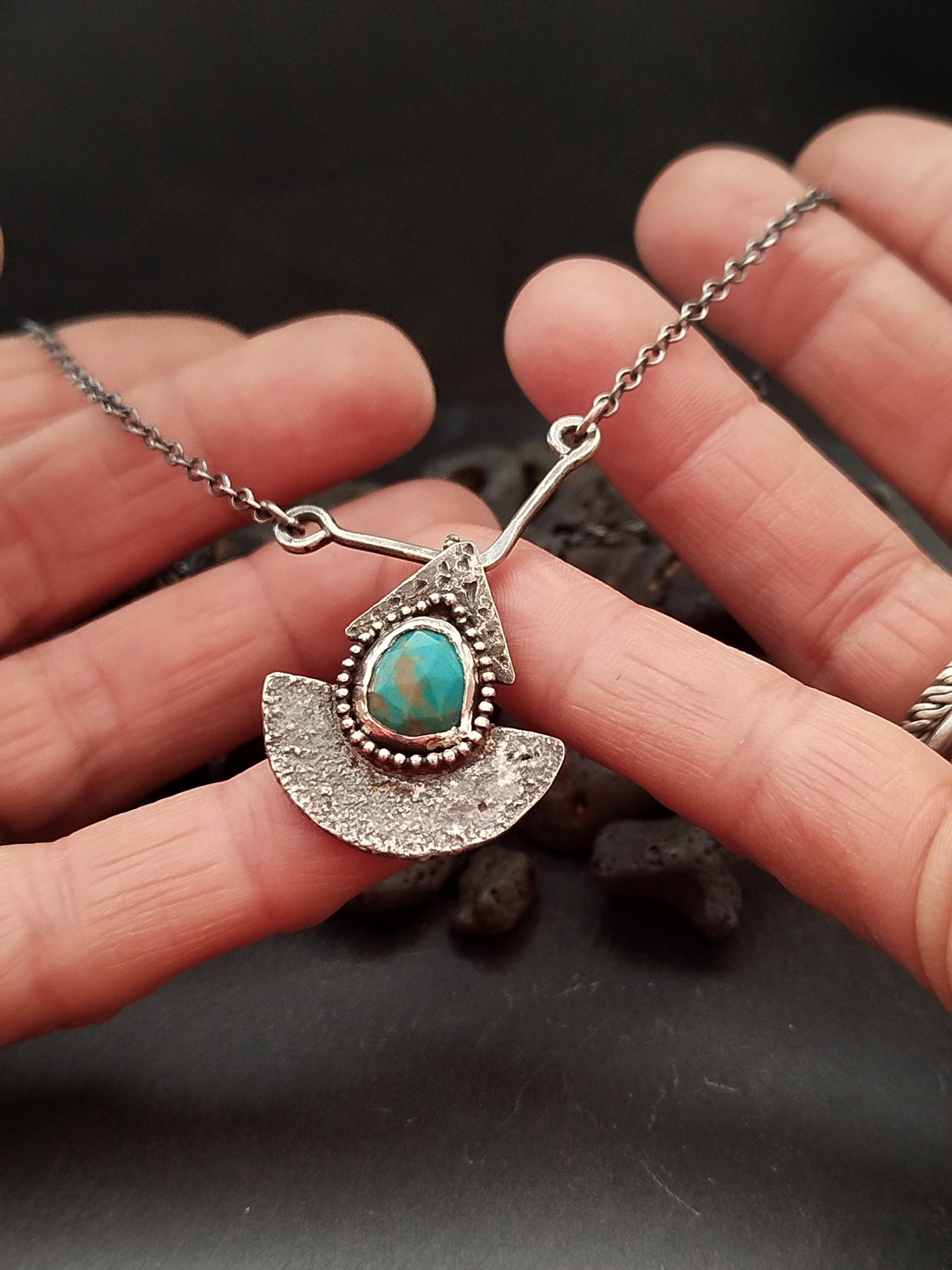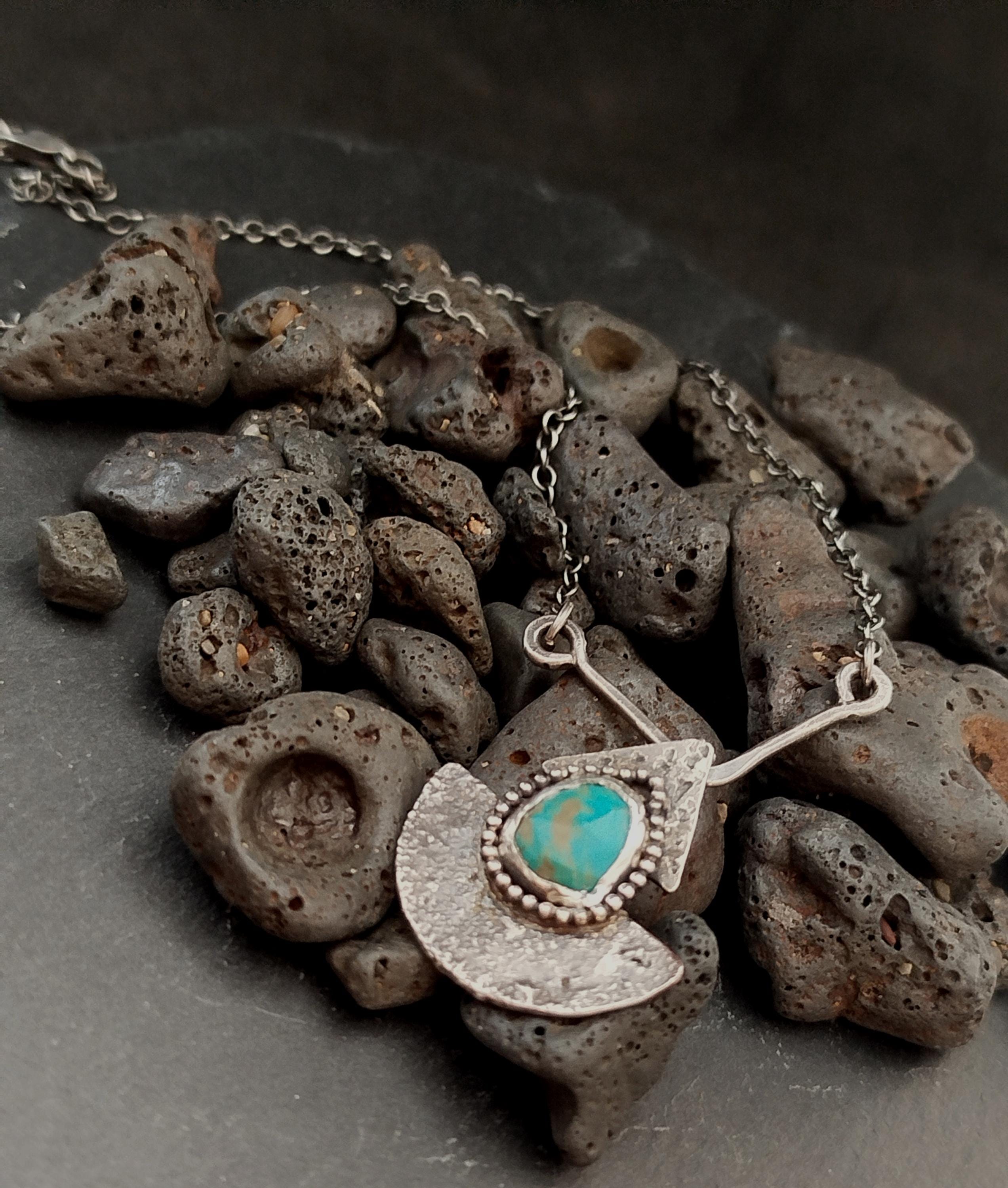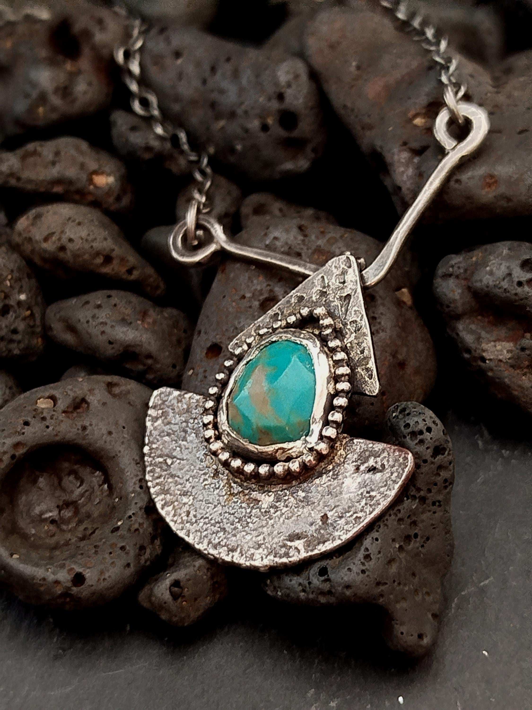 This necklace is a wearable talisman. Entirely handmade in sterling silver, it holds a natural rose cut turquoise, carefully set in a textured, symbolic frame. Turquoise has long been considered as a stone of protection, honest communication, and spiritual healing. The fan-like element beneath the stone evokes breath, openness, and ancient rituals.