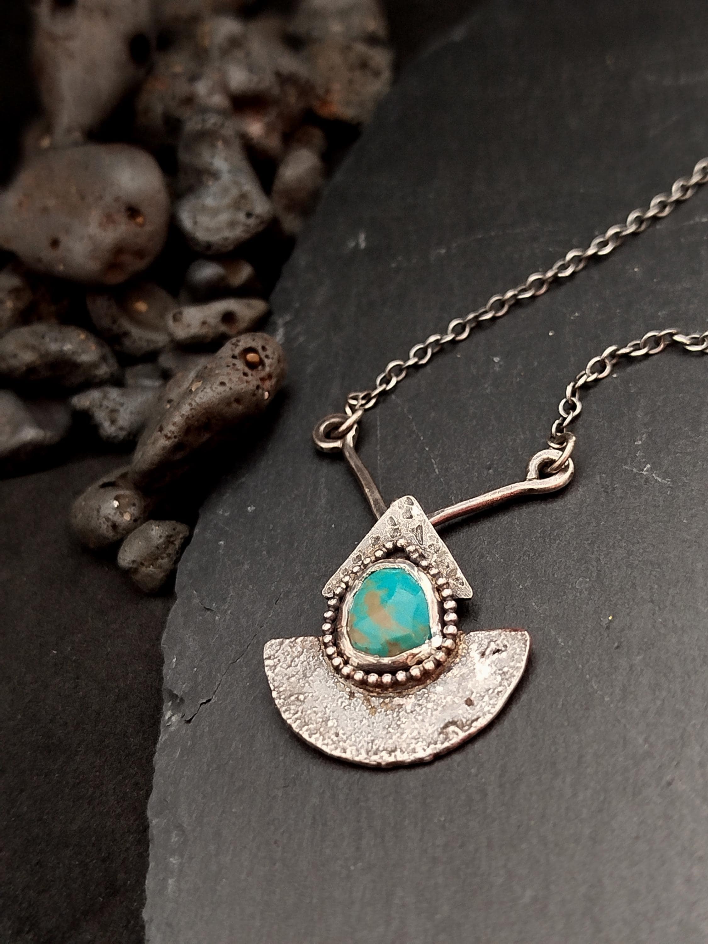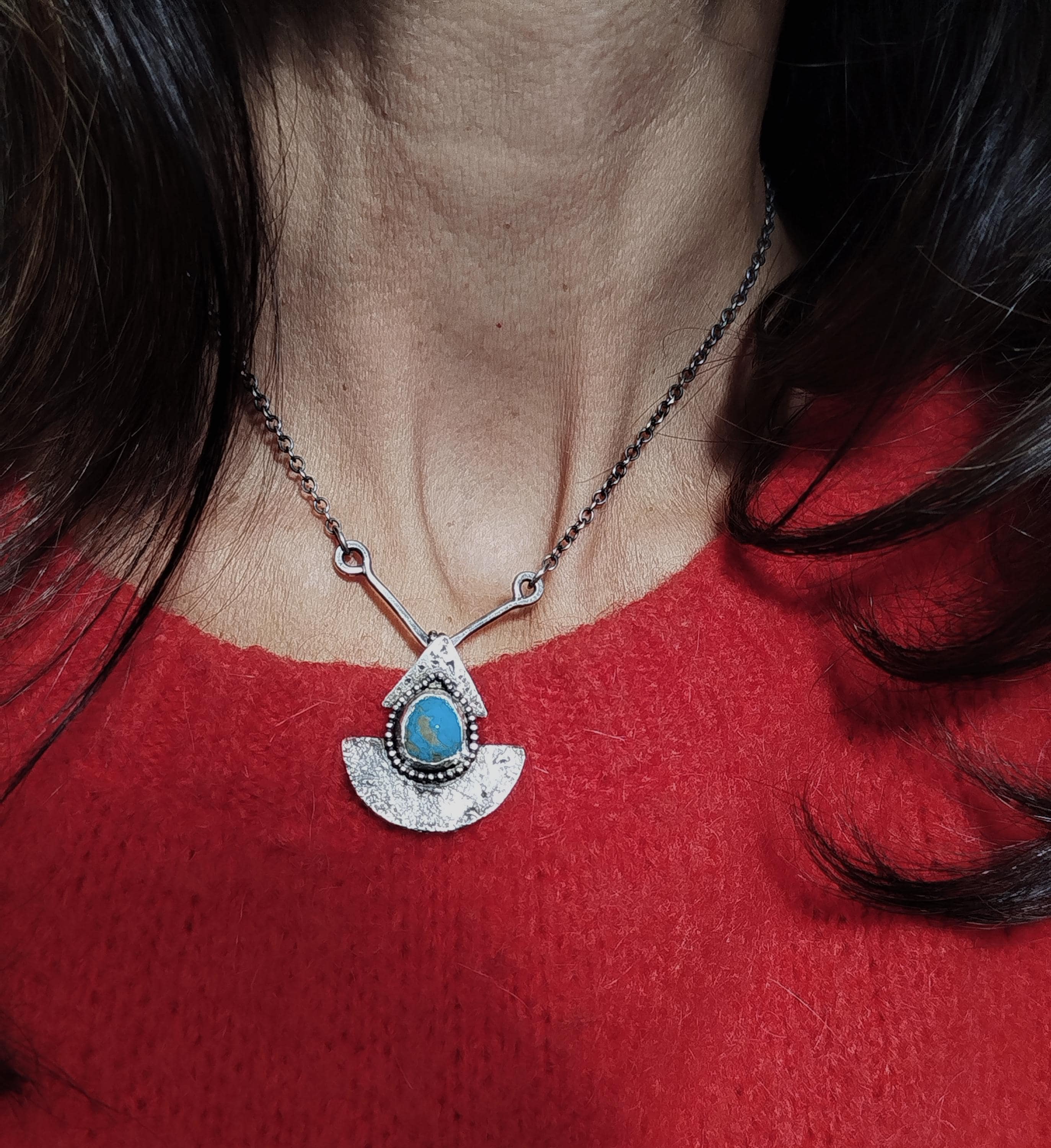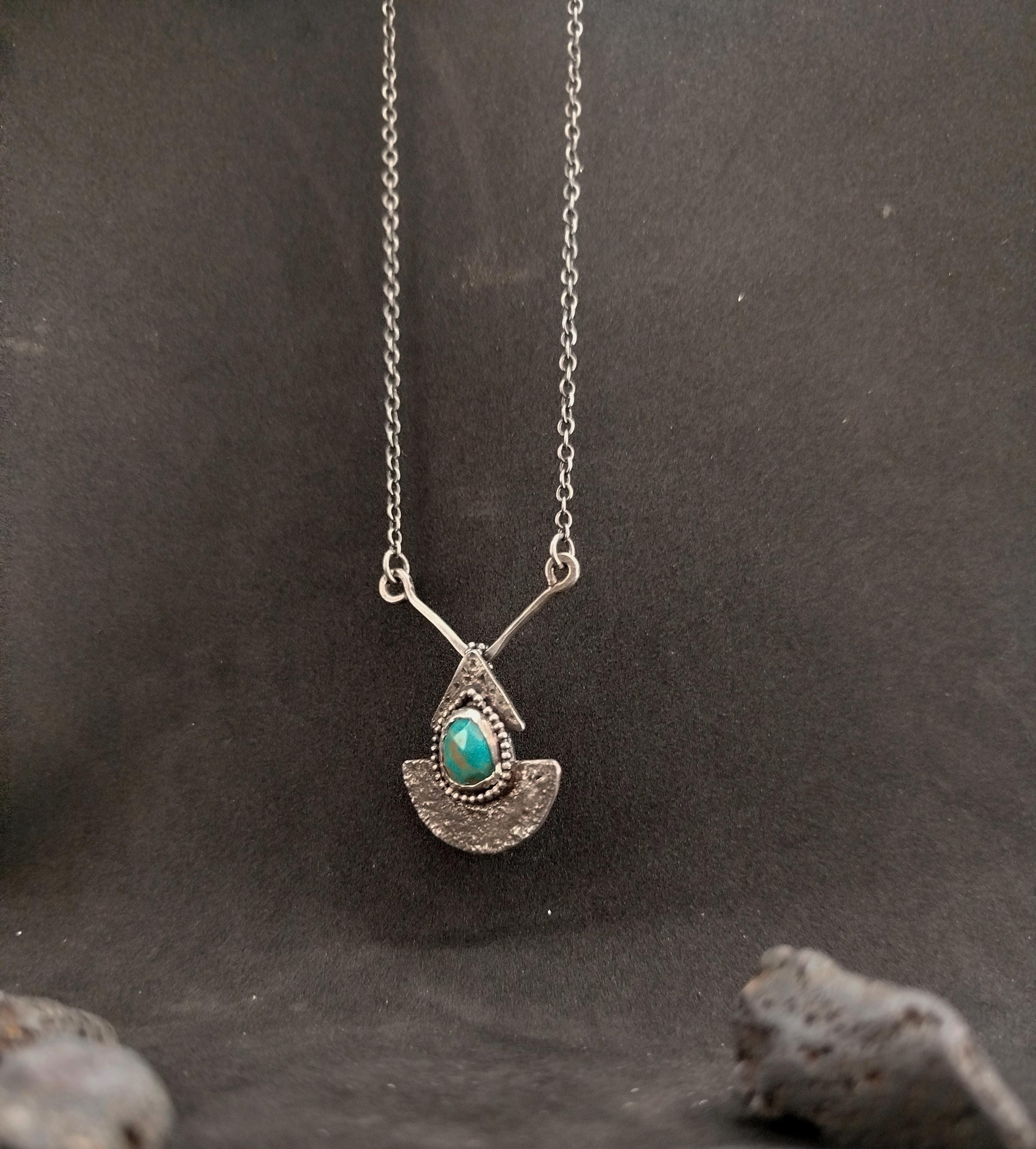 This necklace is a wearable talisman. Entirely handmade in sterling silver, it holds a natural rose cut turquoise, carefully set in a textured, symbolic frame. Turquoise has long been considered as a stone of protection, honest communication, and spiritual healing. The fan-like element beneath the stone evokes breath, openness, and ancient rituals.