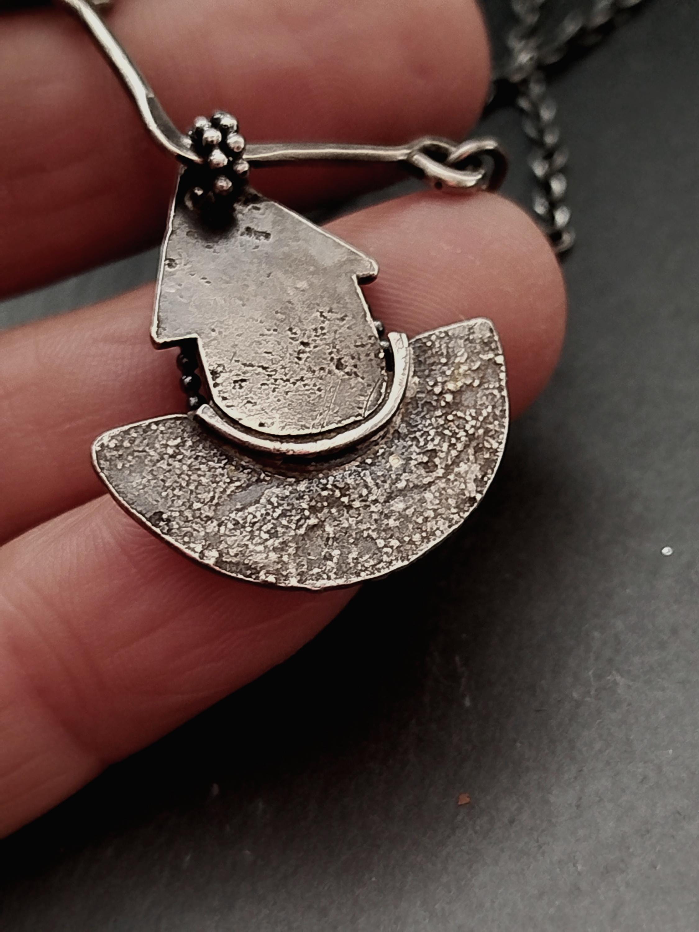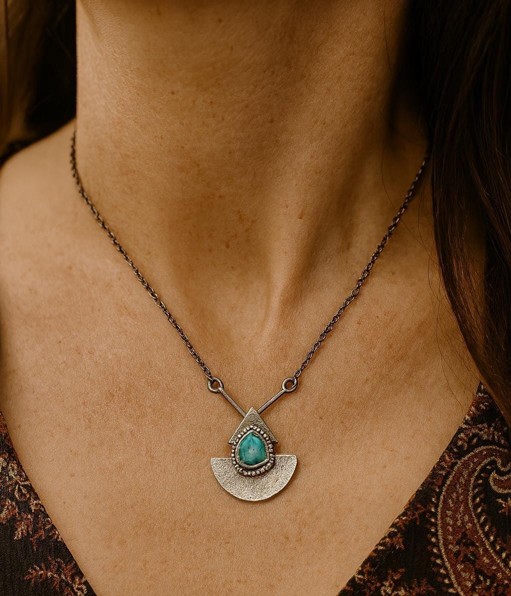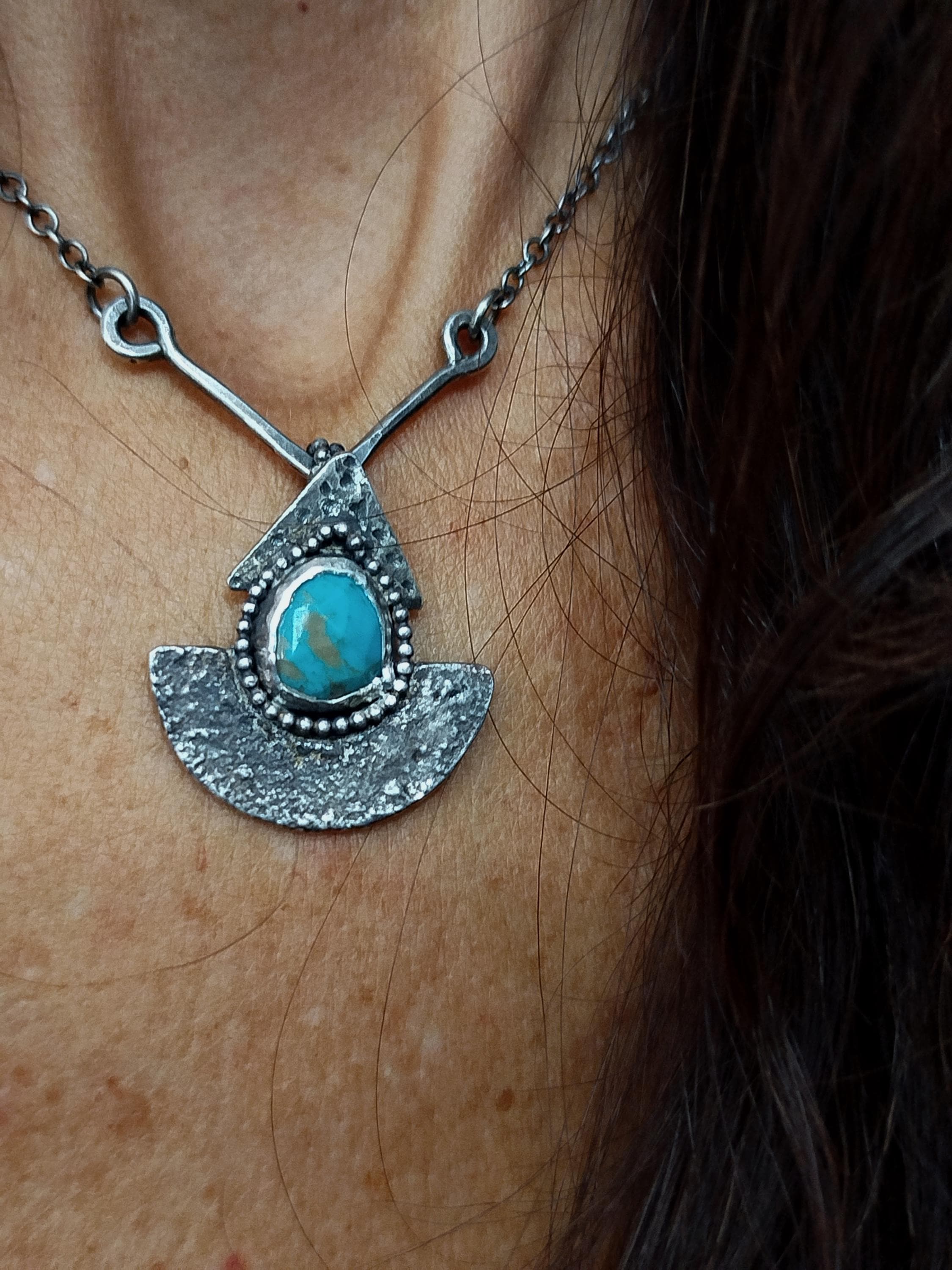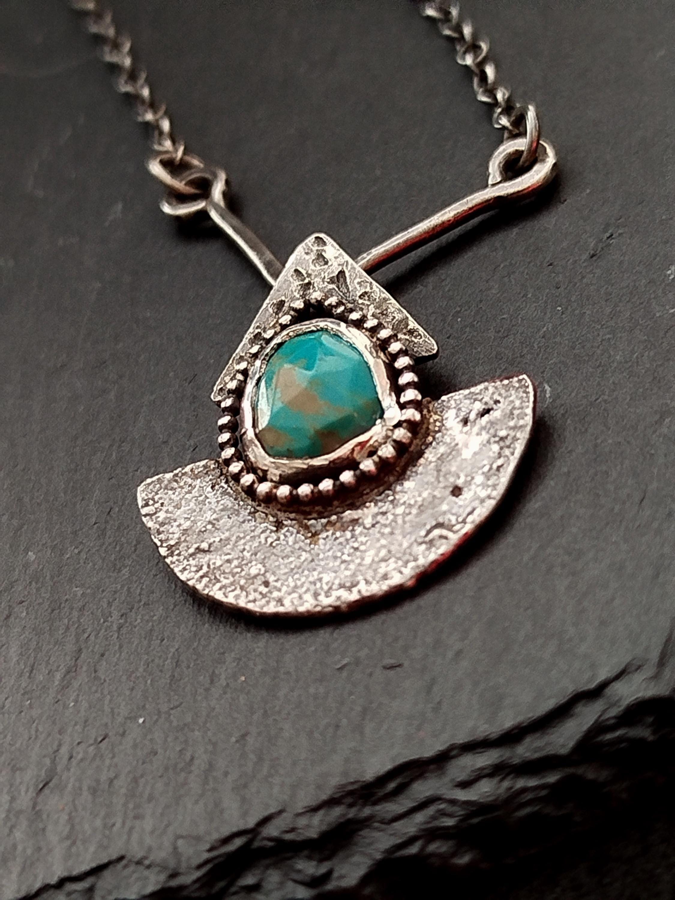 This necklace is a wearable talisman. Entirely handmade in sterling silver, it holds a natural rose cut turquoise, carefully set in a textured, symbolic frame. Turquoise has long been considered as a stone of protection, honest communication, and spiritual healing. The fan-like element beneath the stone evokes breath, openness, and ancient rituals.
