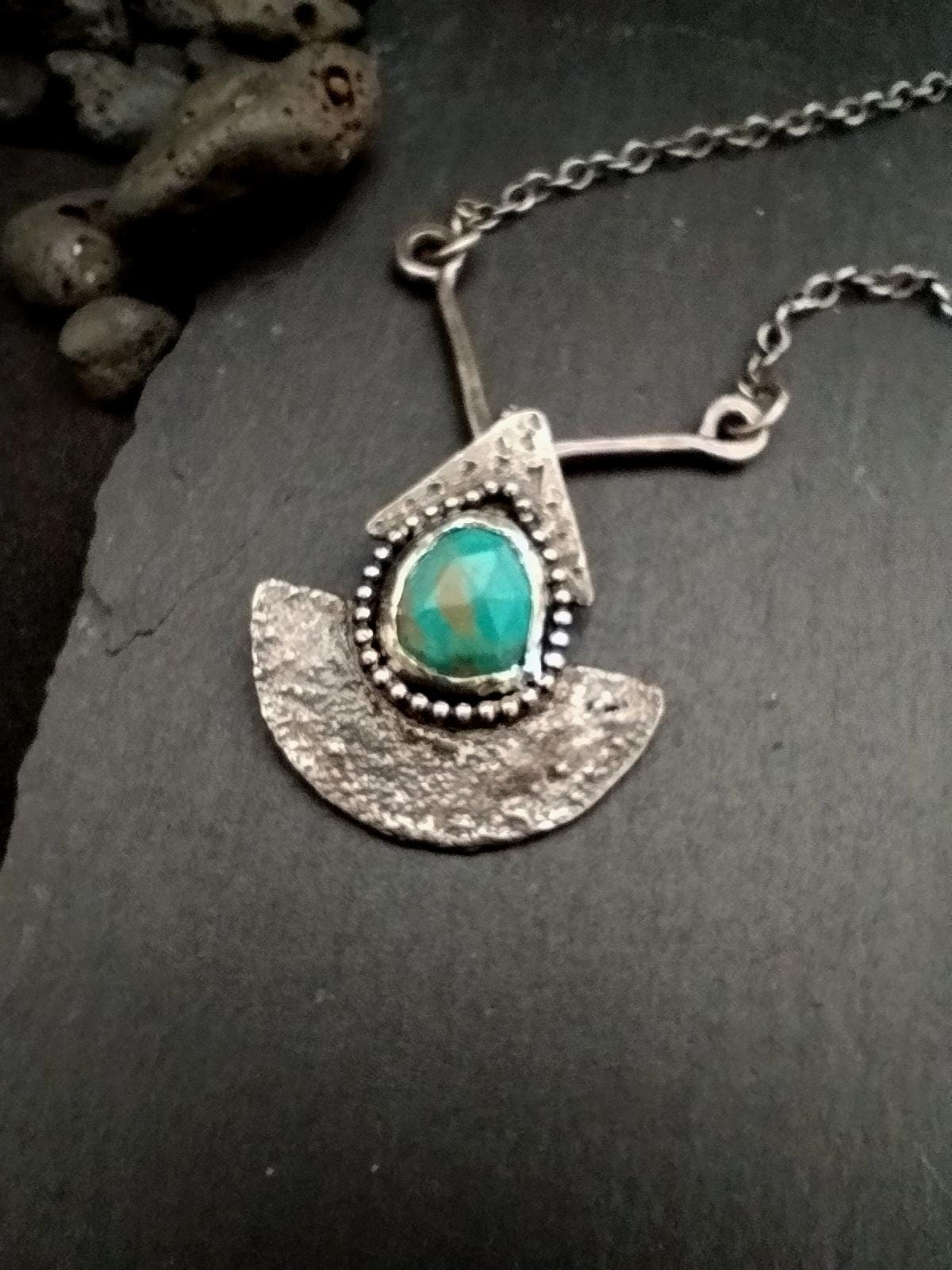 Handmade silver turquoise talisman necklace, Protective artisan jewelry, Rose cut turquoise amulet