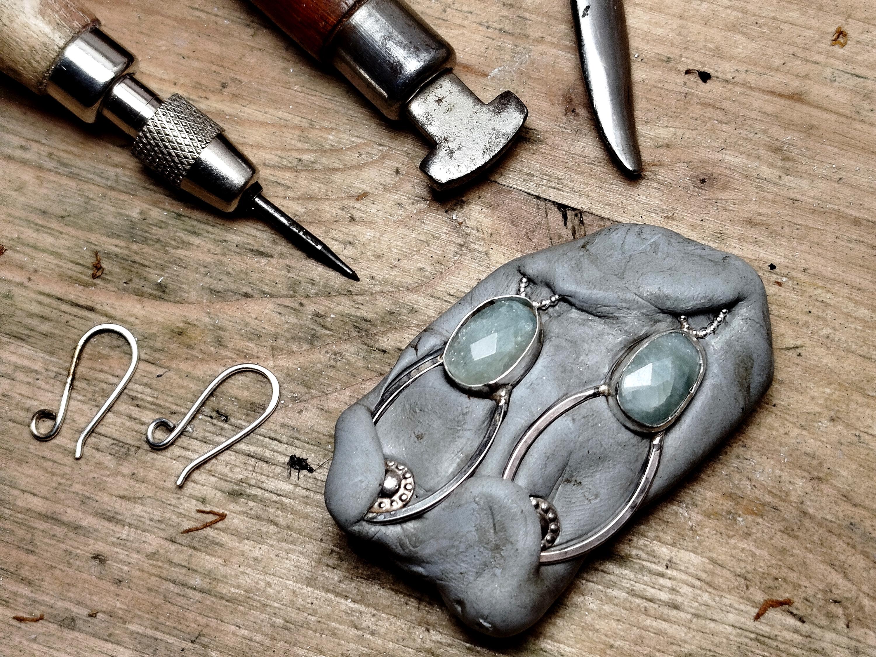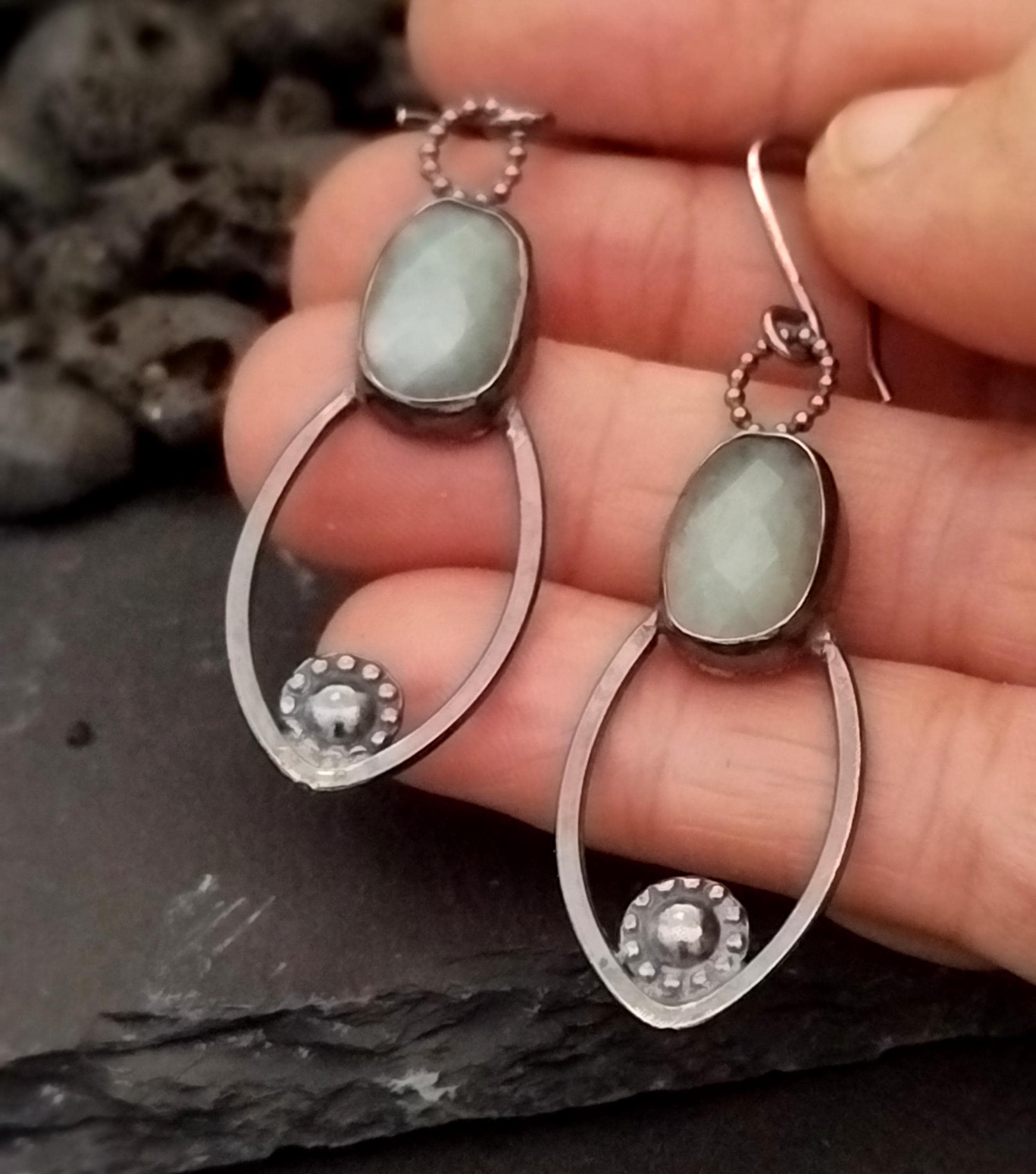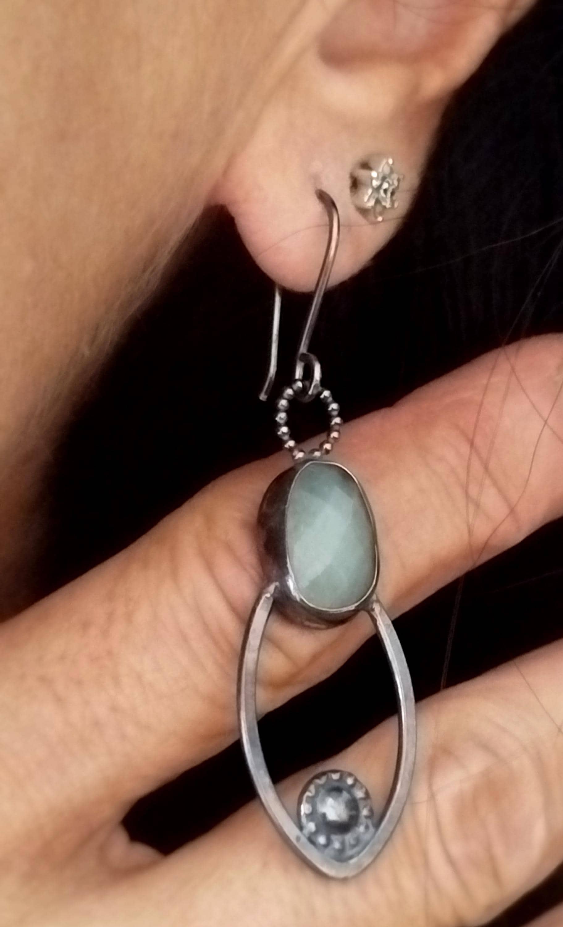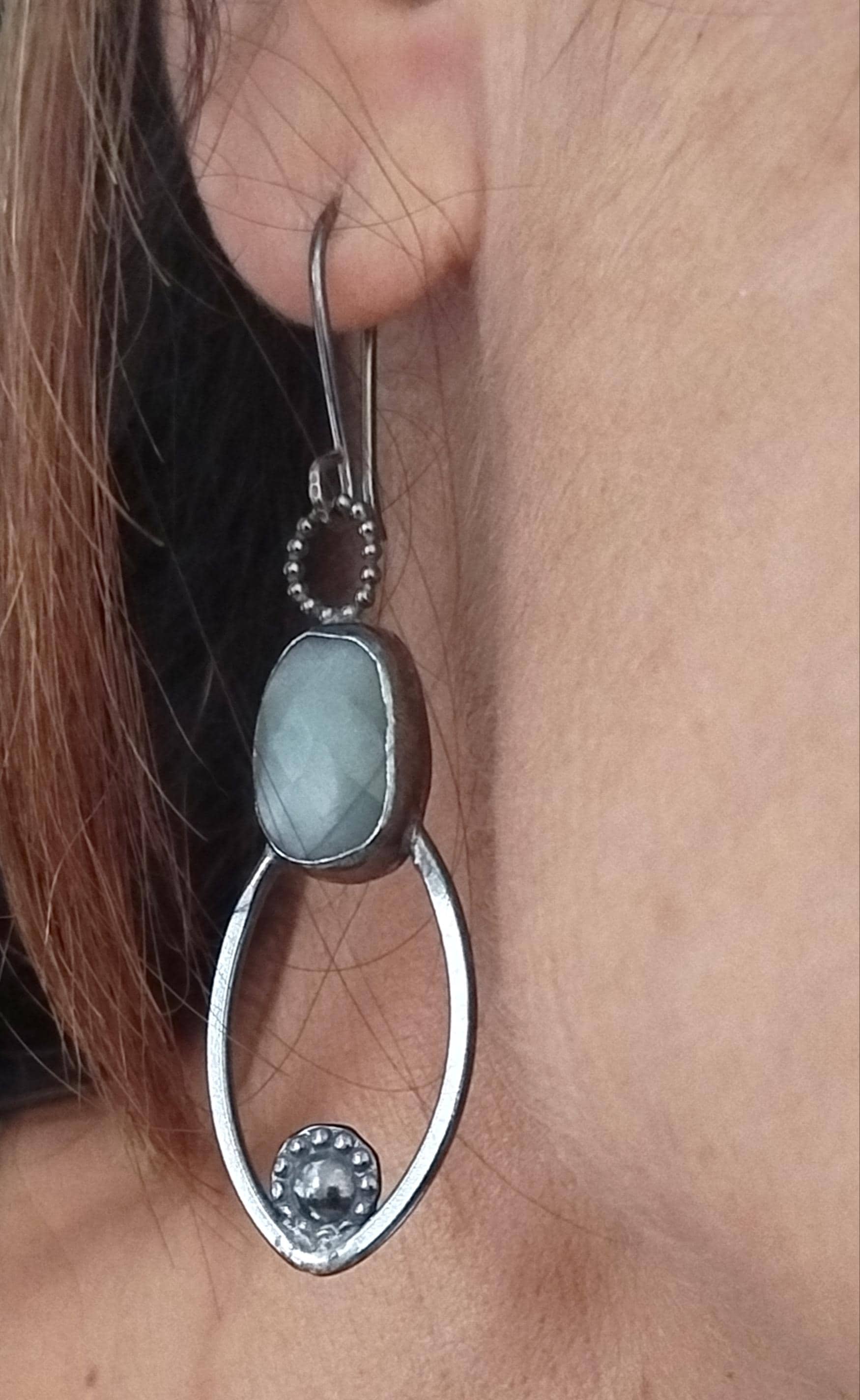 Sterling silver earrings with aquamarine cabochon, handmade talisman for serenity, March Birthstone