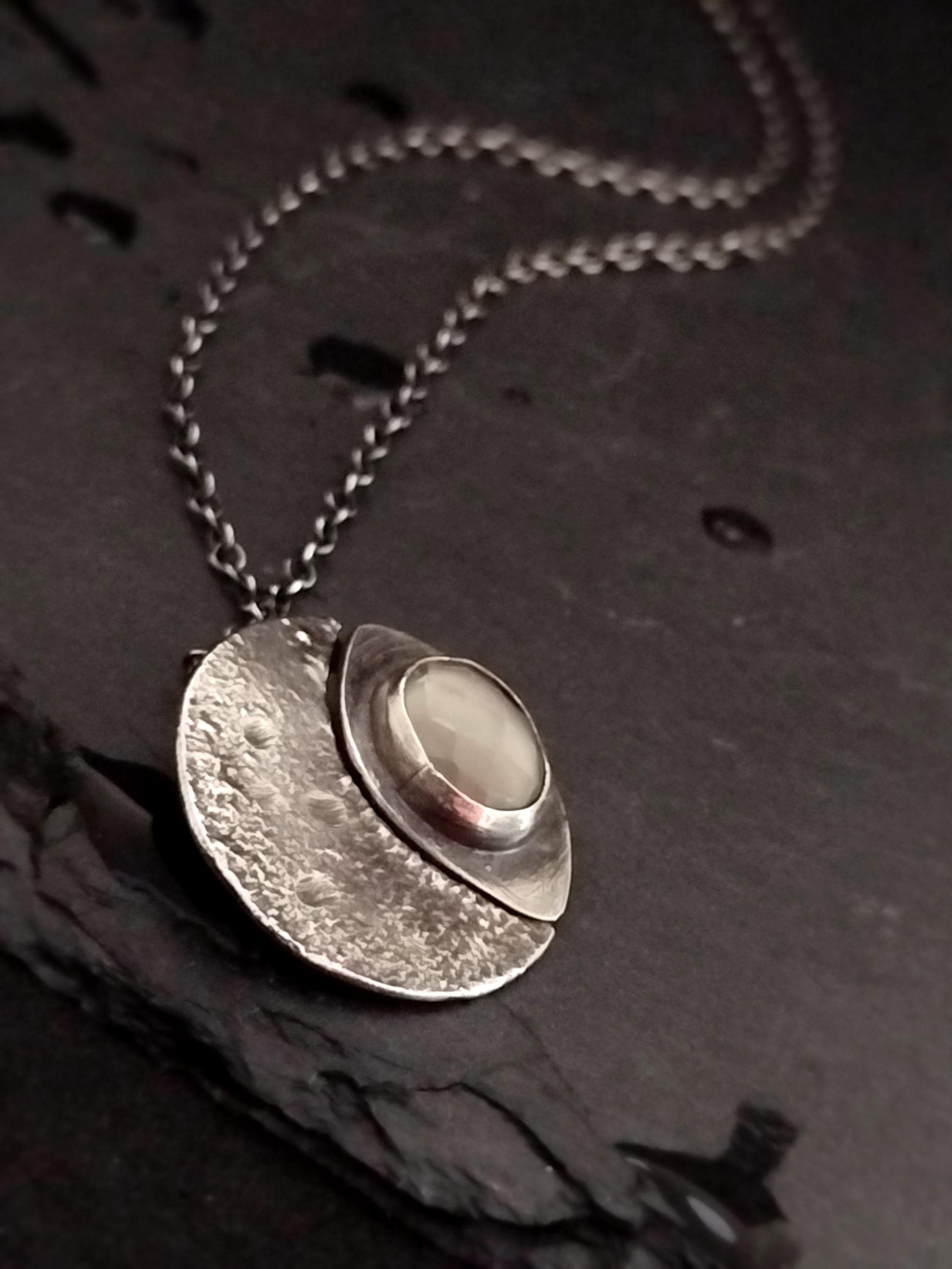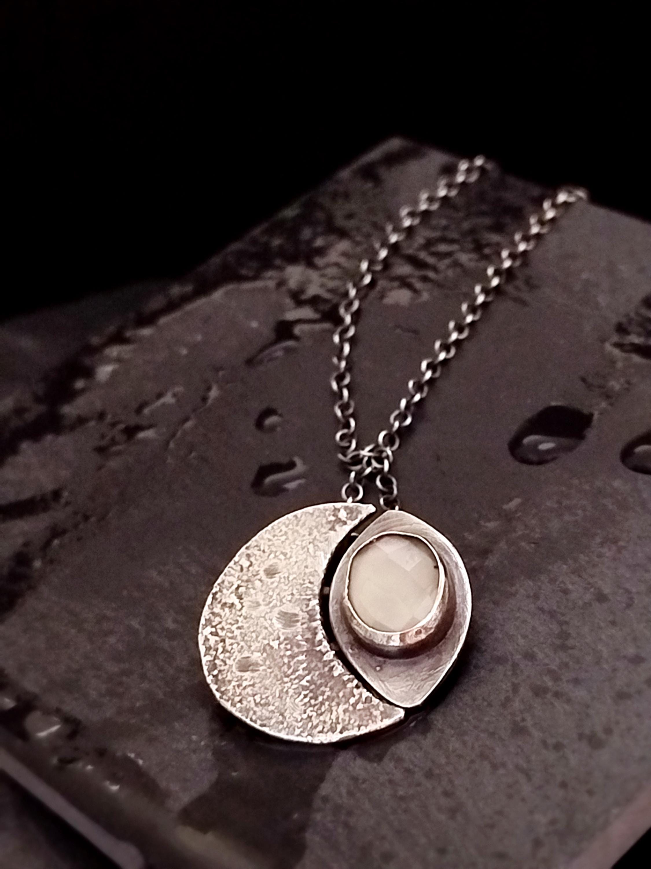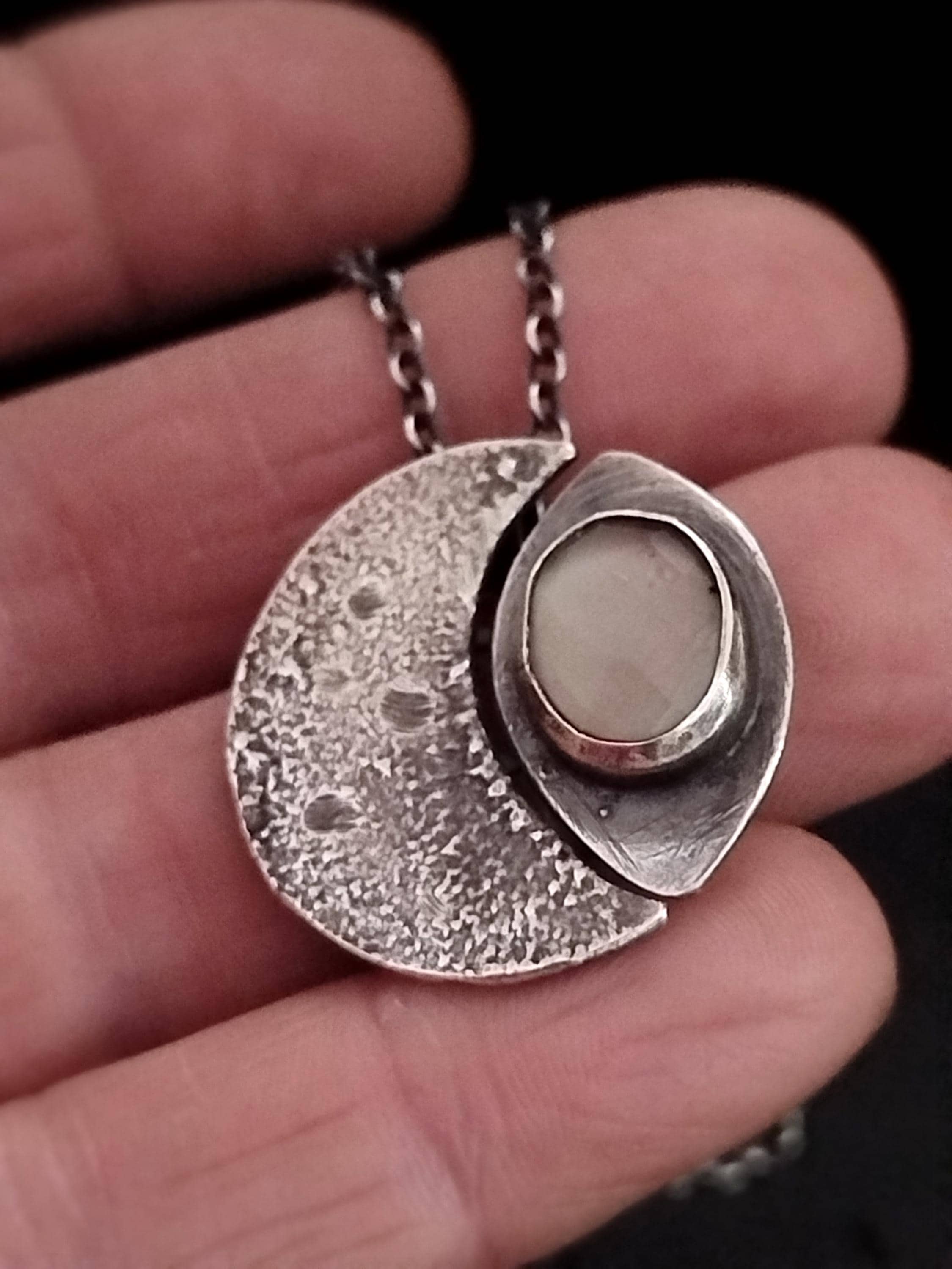 Moonstone and Reticulated Silver Lunar Pendant, Handmade Ritual Necklace in 925 Sterling Silver