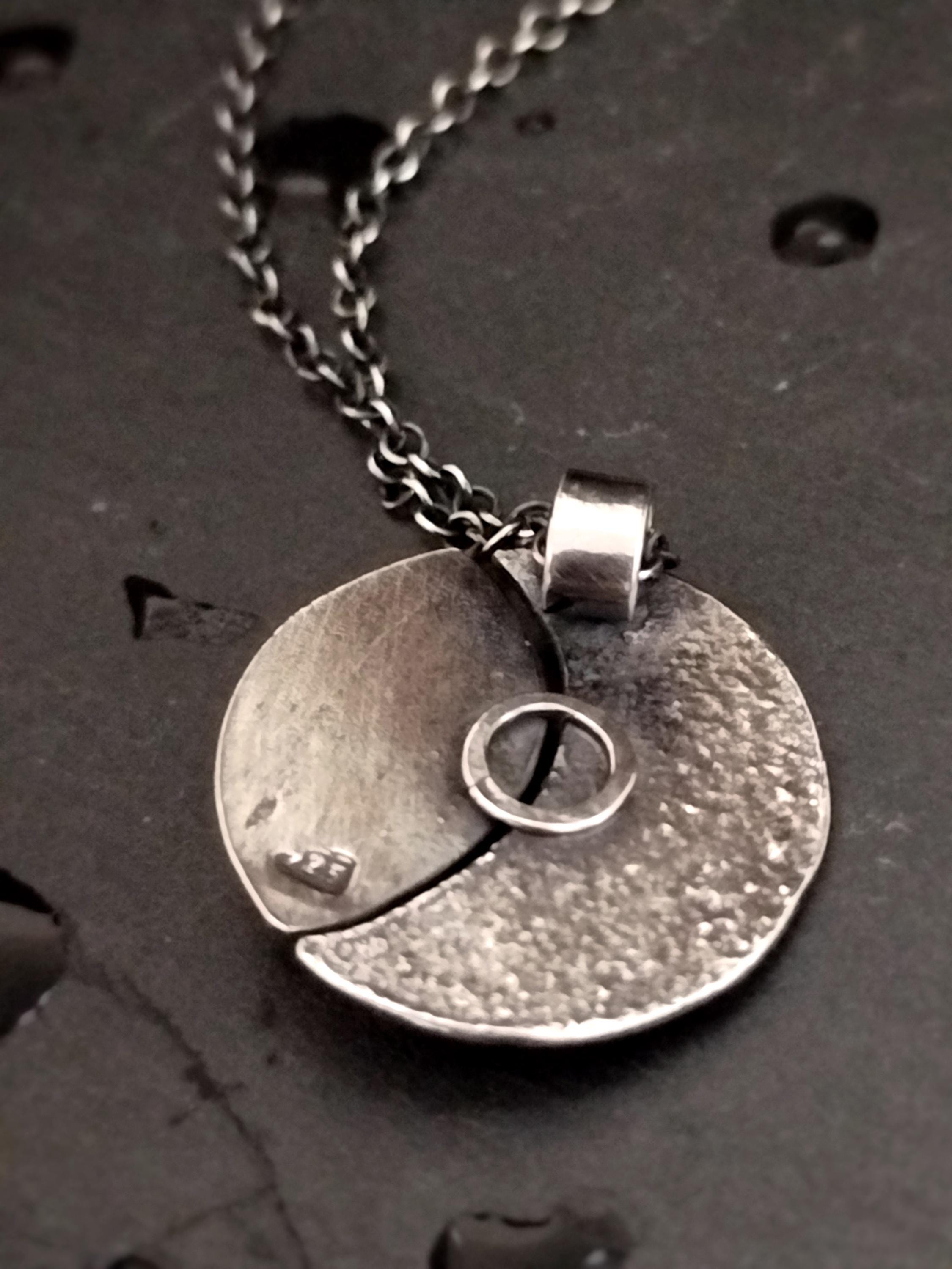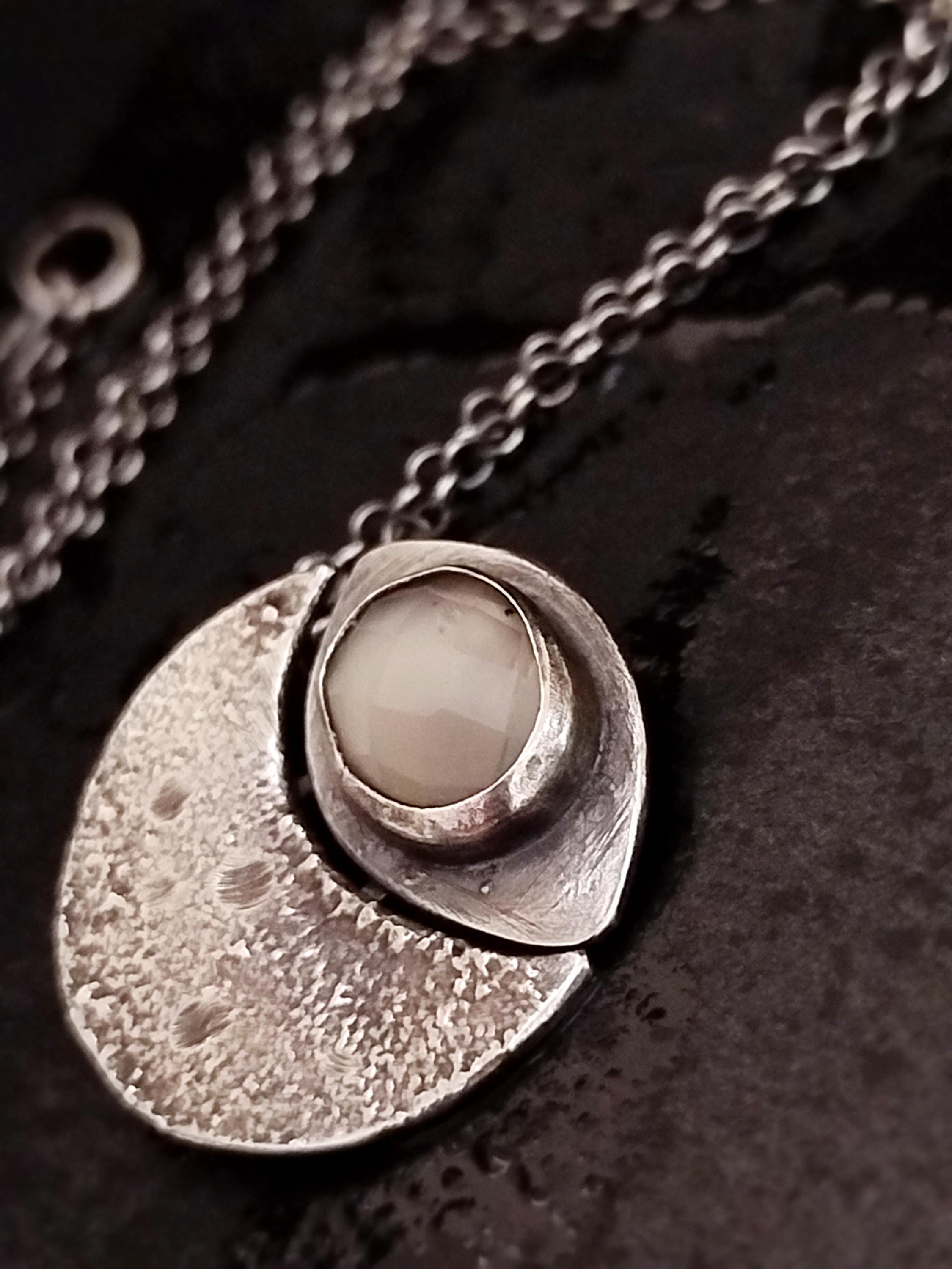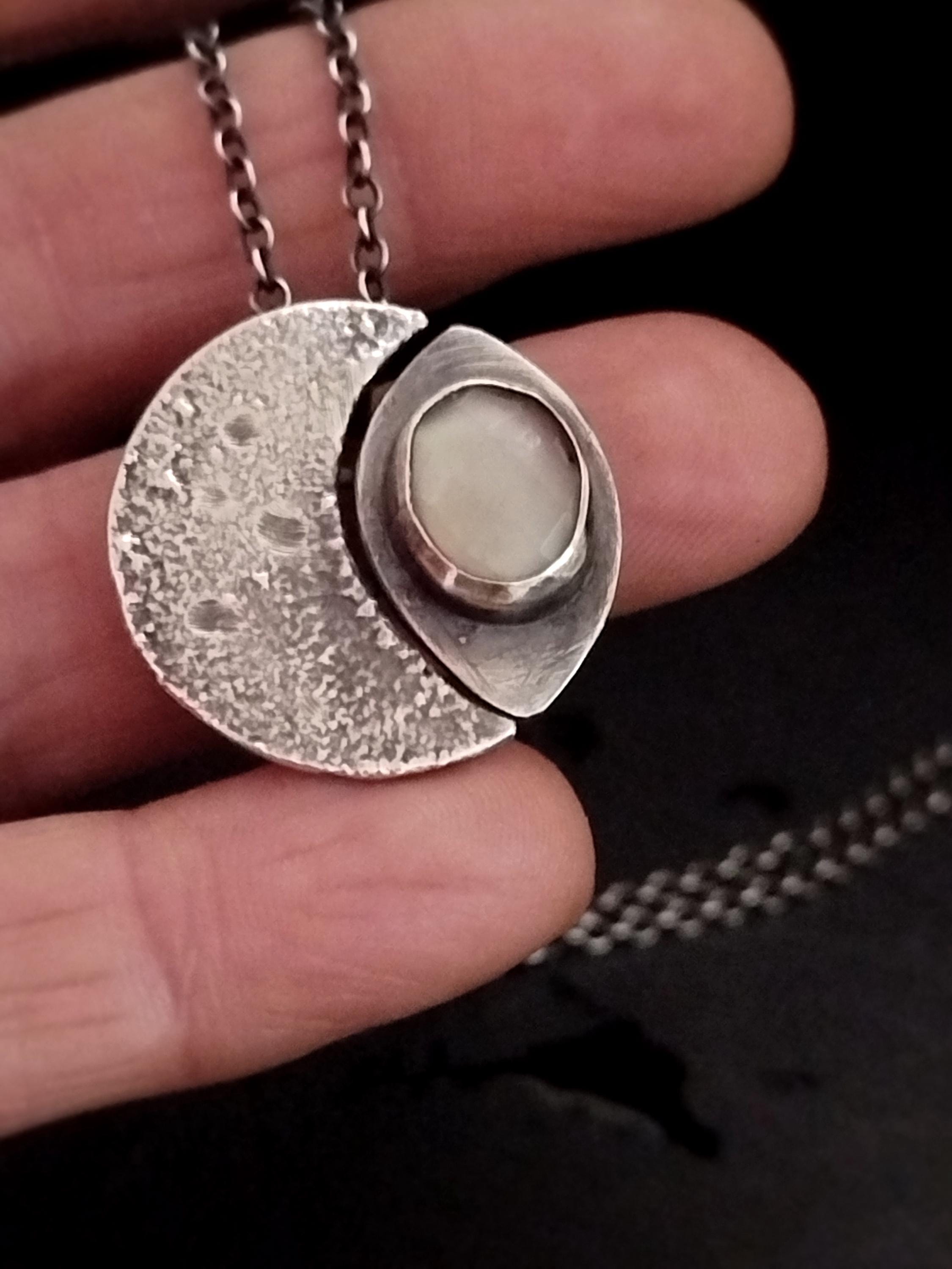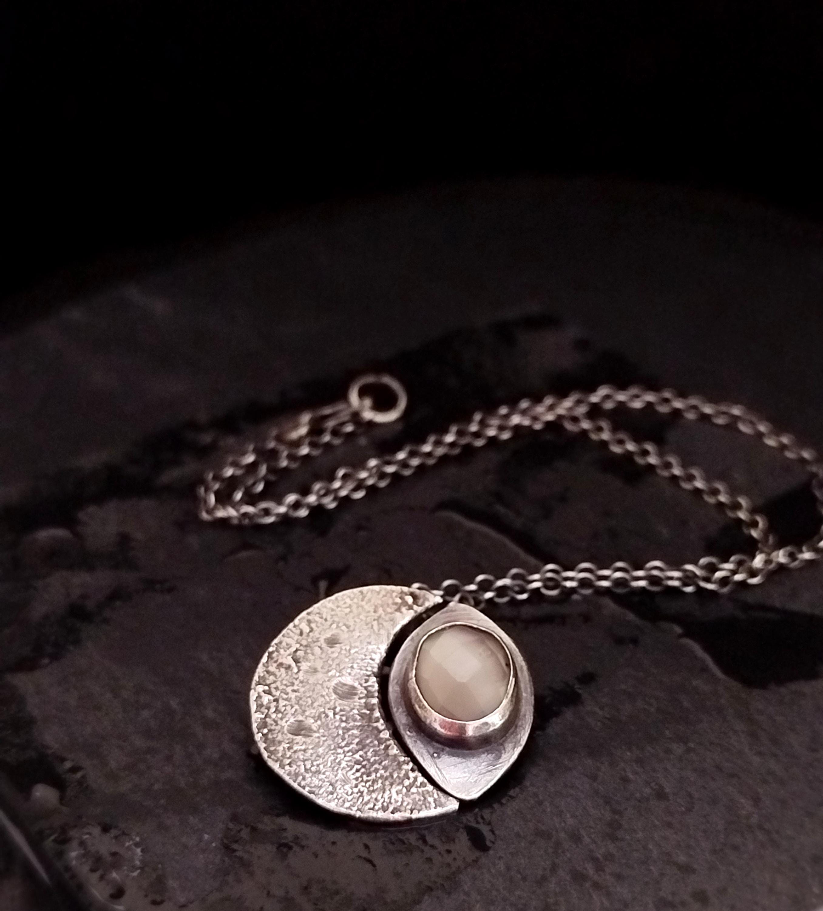 Moonstone and Reticulated Silver Lunar Pendant, Handmade Ritual Necklace in 925 Sterling Silver