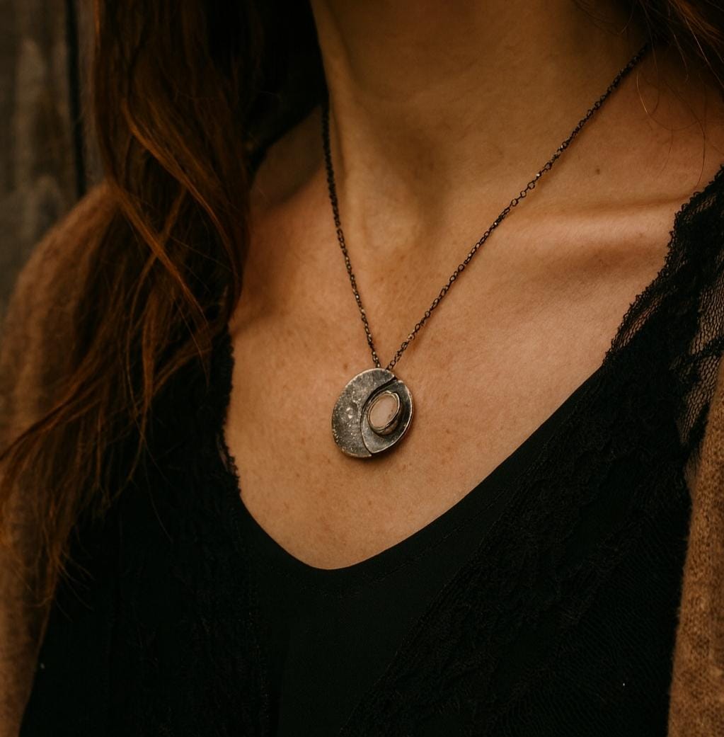 Forged under the sign of the moon, this 925 sterling silver necklace celebrates the beauty of celestial imperfections. The reticulated surface evokes lunar craters and dreamlike landscapes, while the central stone — a rose-cut moonstone — refracts visions and intuition. Every detail is handcrafted with ritual care and symbolic spirit. A talisman for those who walk between visions and inner cycles, suspended between light and shadow.