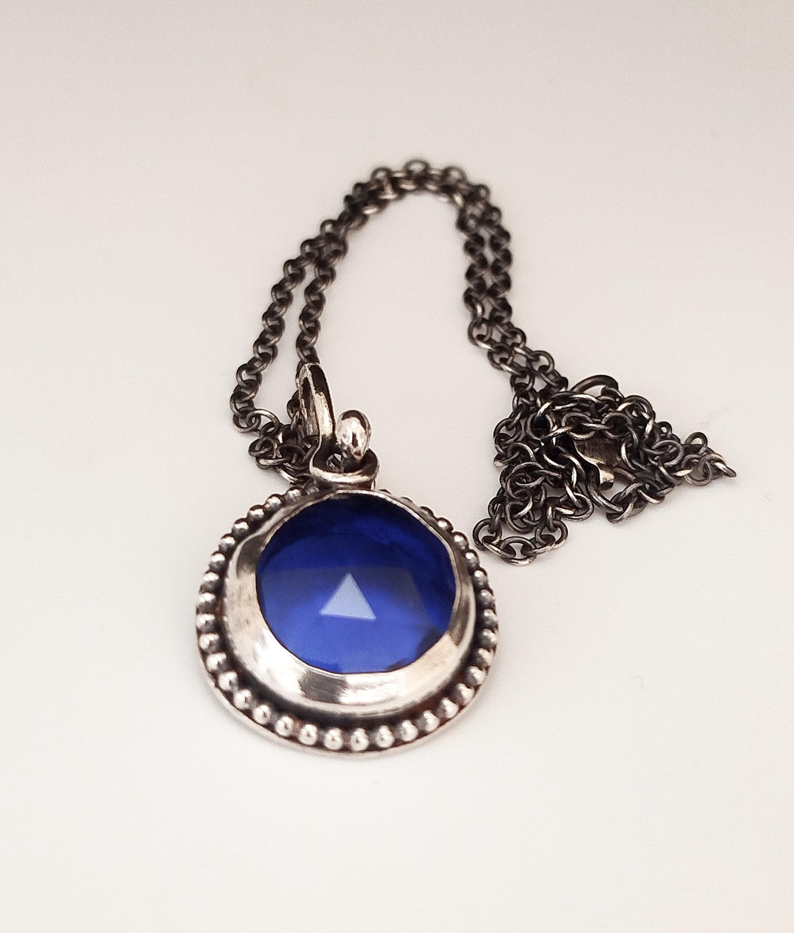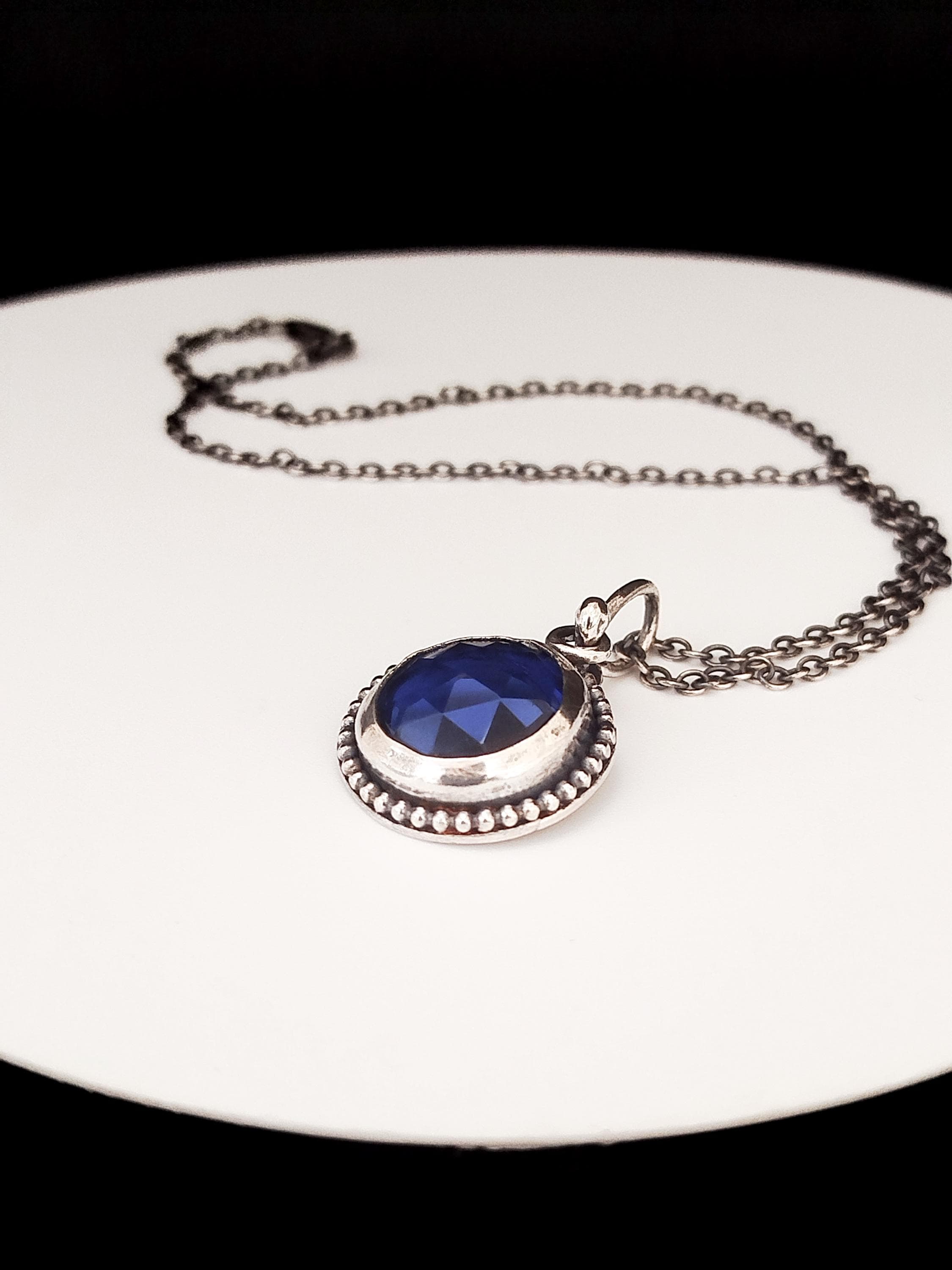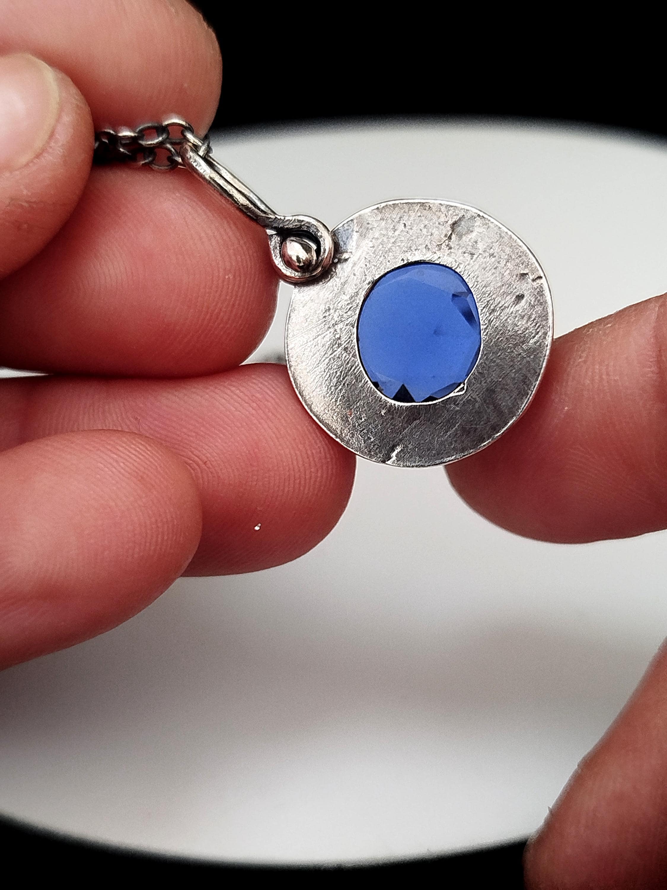 925 sterling silver necklace with lab‑created blue sapphire cabochon – handmade artisan jewelry