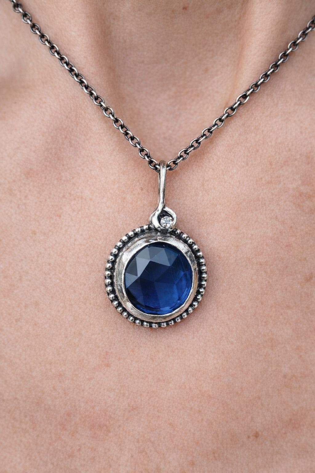 This necklace is entirely handcrafted in 925 sterling silver, shaped and finished by hand in my studio in Tuscany. At the center of the pendant lies a faceted Lab-created deep blue sapphire.